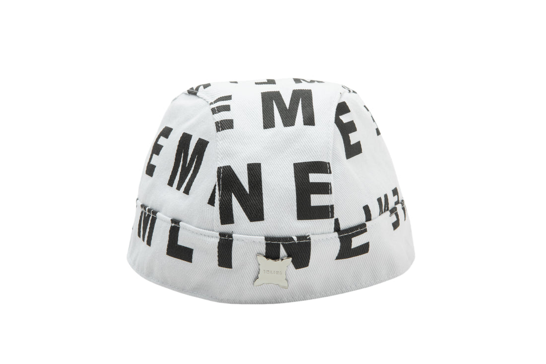 Denim biker hat in white. Screen print through in black. Logo pin at crown. Tie...
