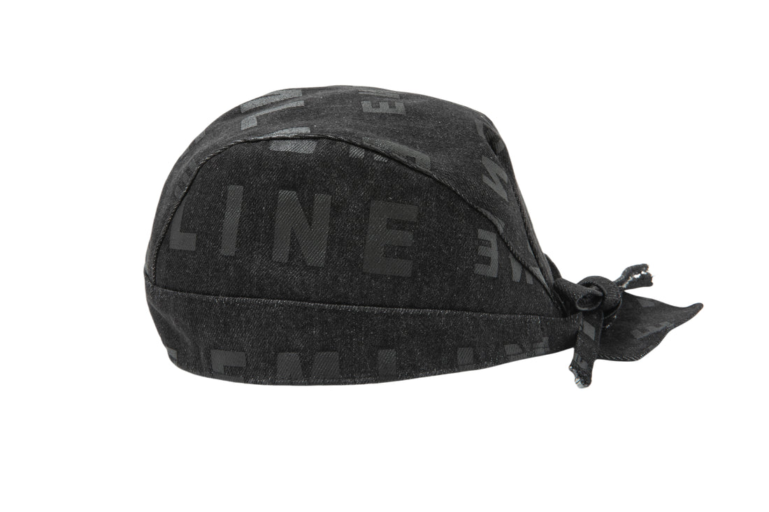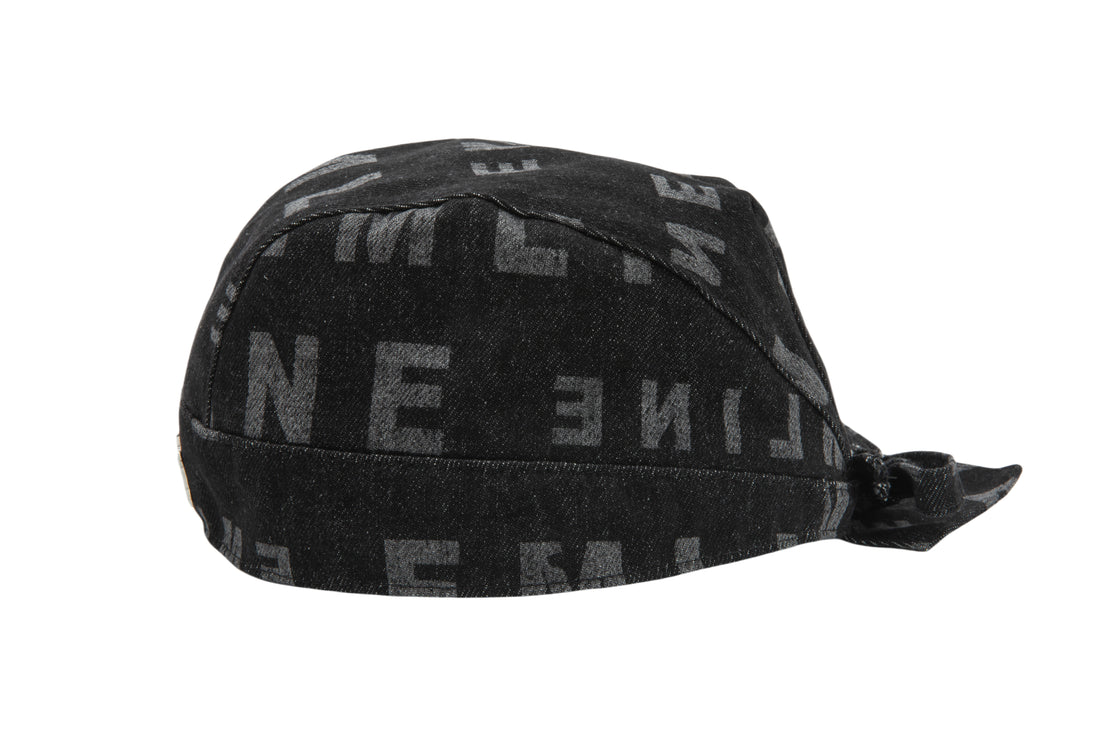 Denim biker hat in black and denim. Logo throughout in gray. Logo pin at crown....