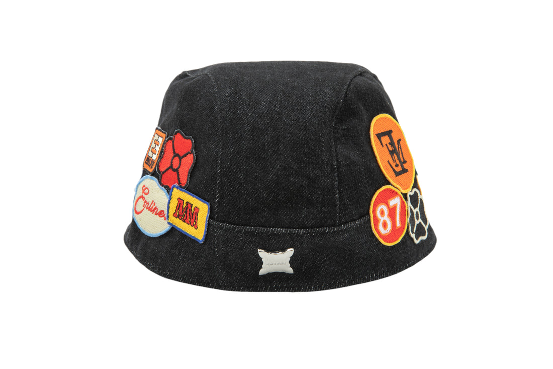Denim biker hat in ash black. Embroidery patches throughout in multi color. Logo pin at...