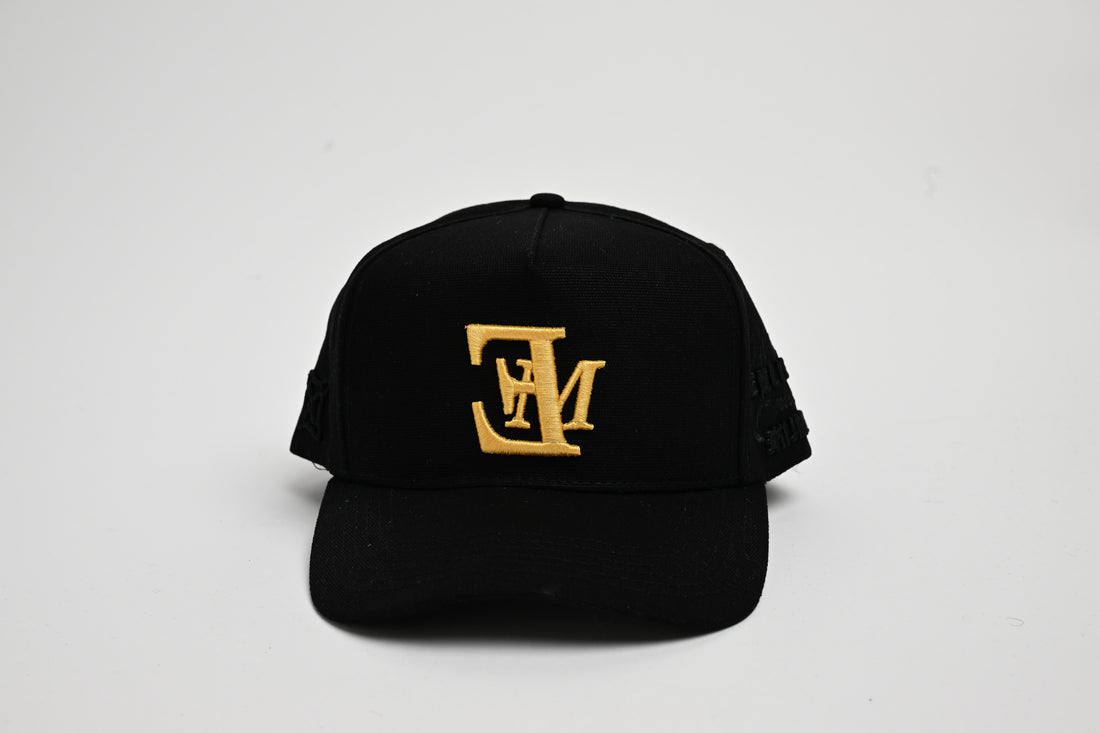 5 panel canvas cap in black. 3D embroidery logo at front in yellow, at side...
