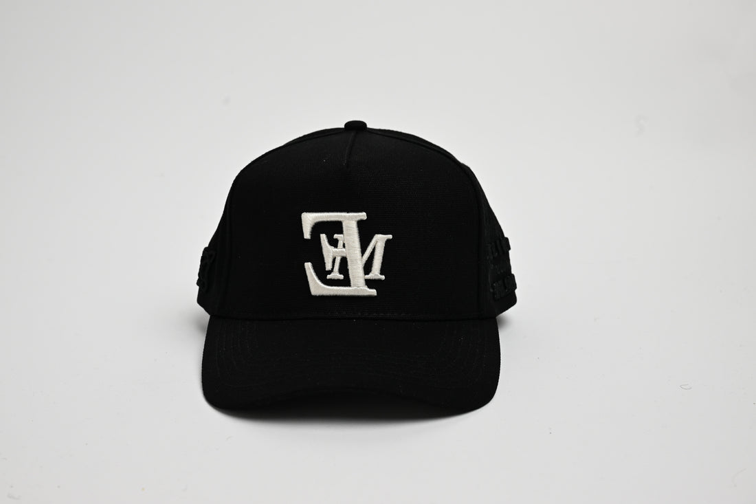 5 panel canvas cap in black. 3D embroidery logo at front in white, at side...