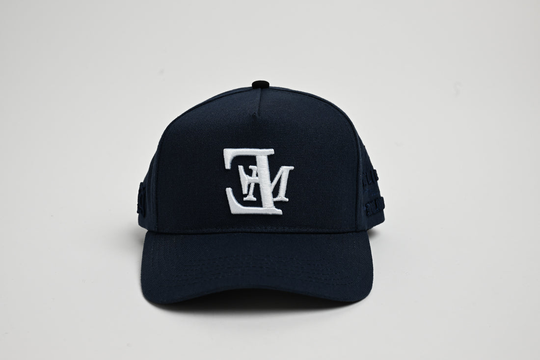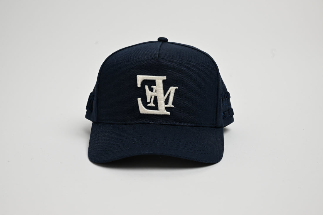 5 panel canvas cap in navy. 3D embroidery logo at front in white, at side...