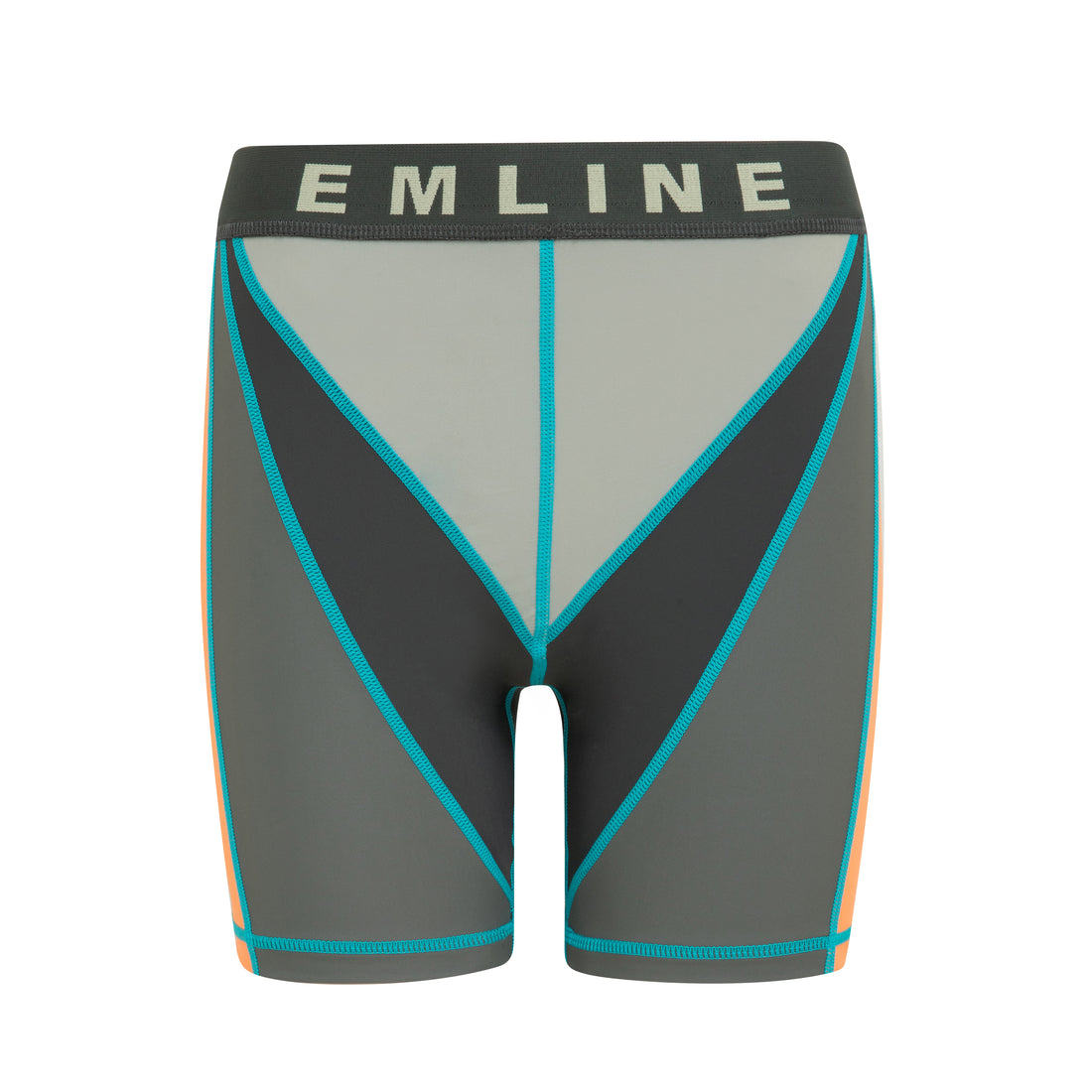 Stretch nylon in gray and orange. Screen print logo at right and left leg in...