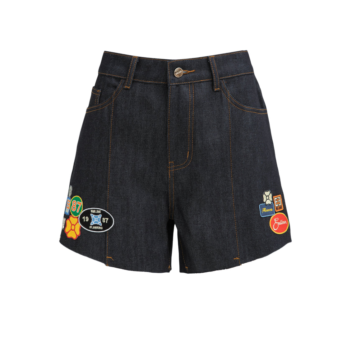 Indigo Denim shorts. Embroidery patches throughout in multi color. Silver single button and zipper fly....