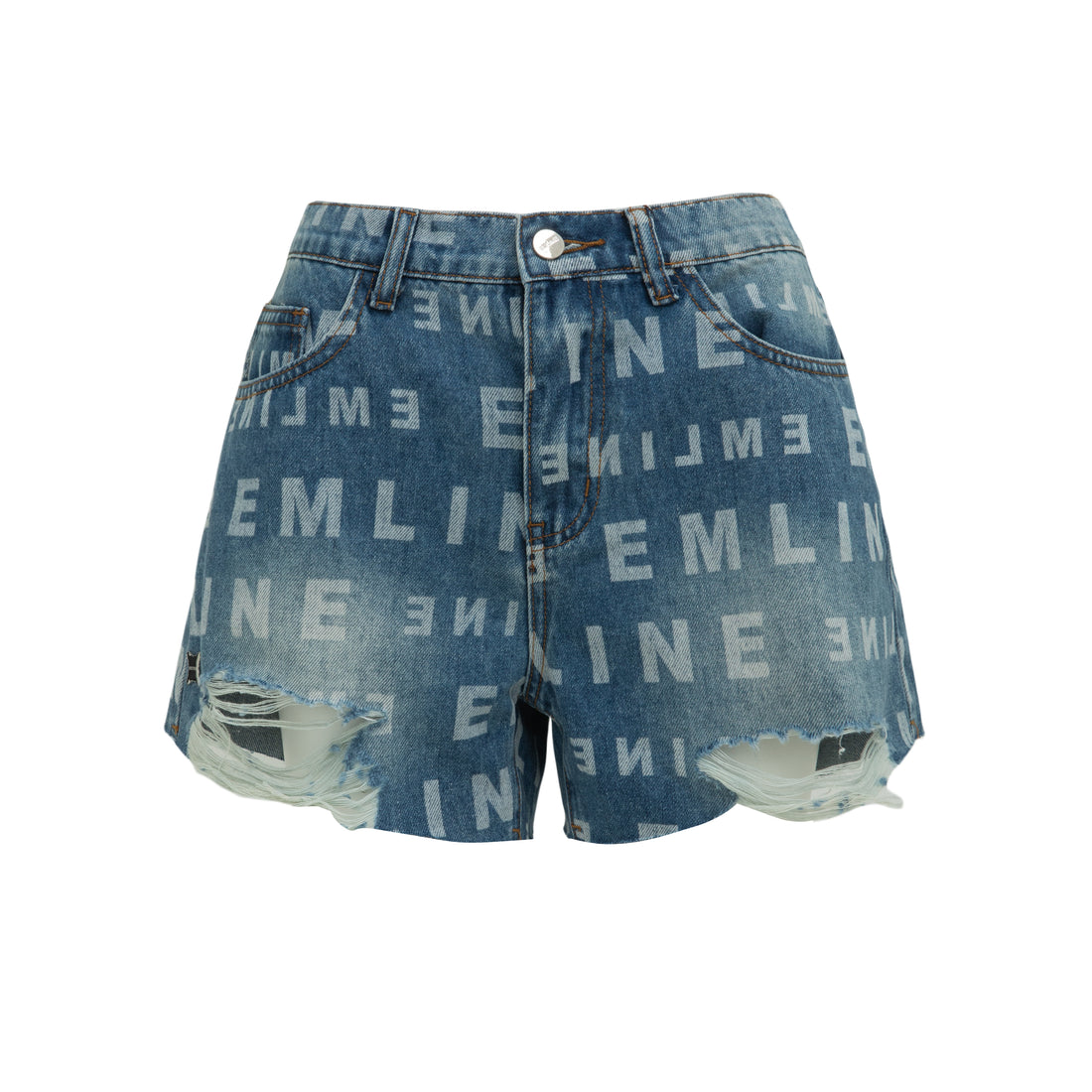 Blue Denim shorts. Screen print in light blue. Silver single button and zipper fly. Distressing...