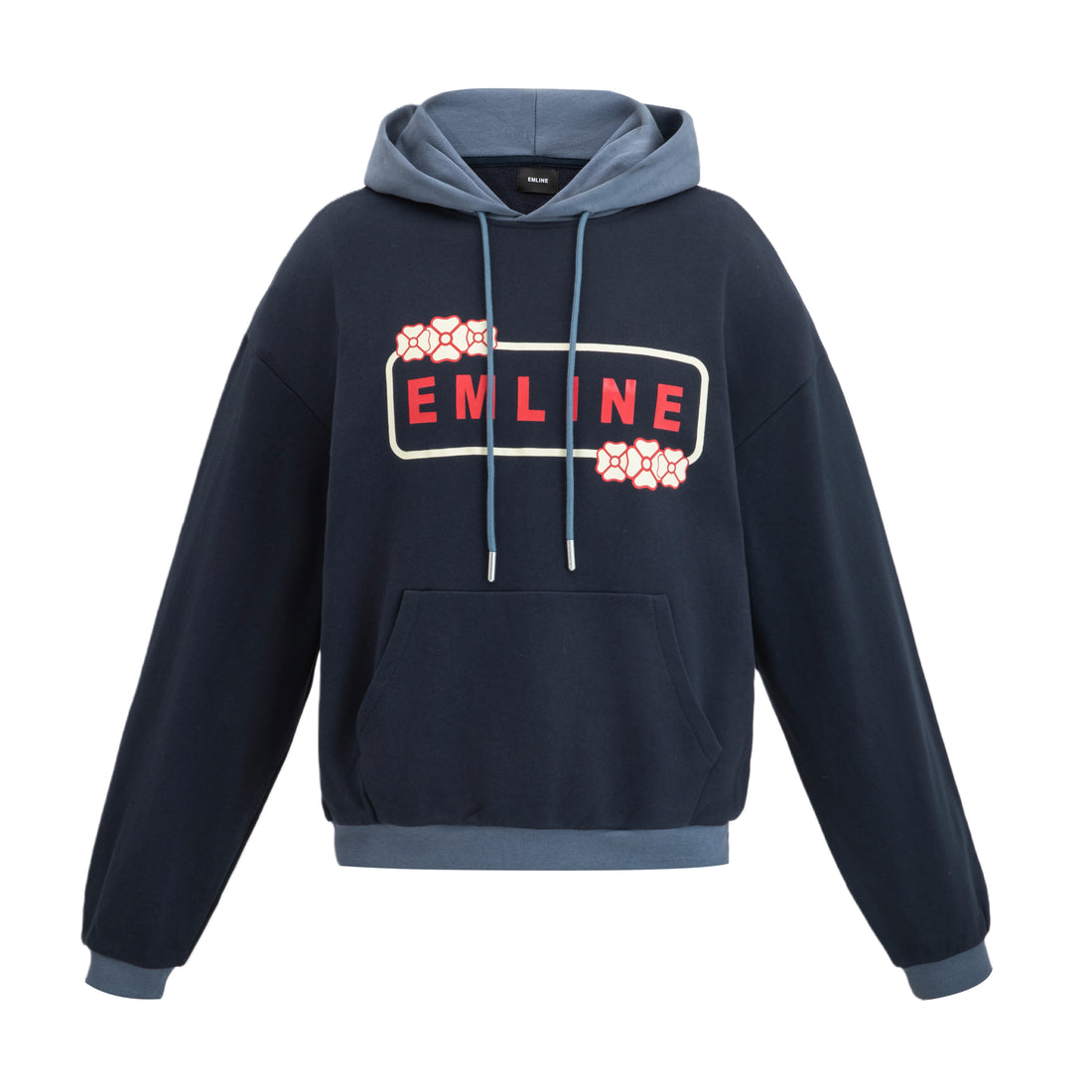 100% French Terry hoodie in navy. Screen print at front and back in cream and...