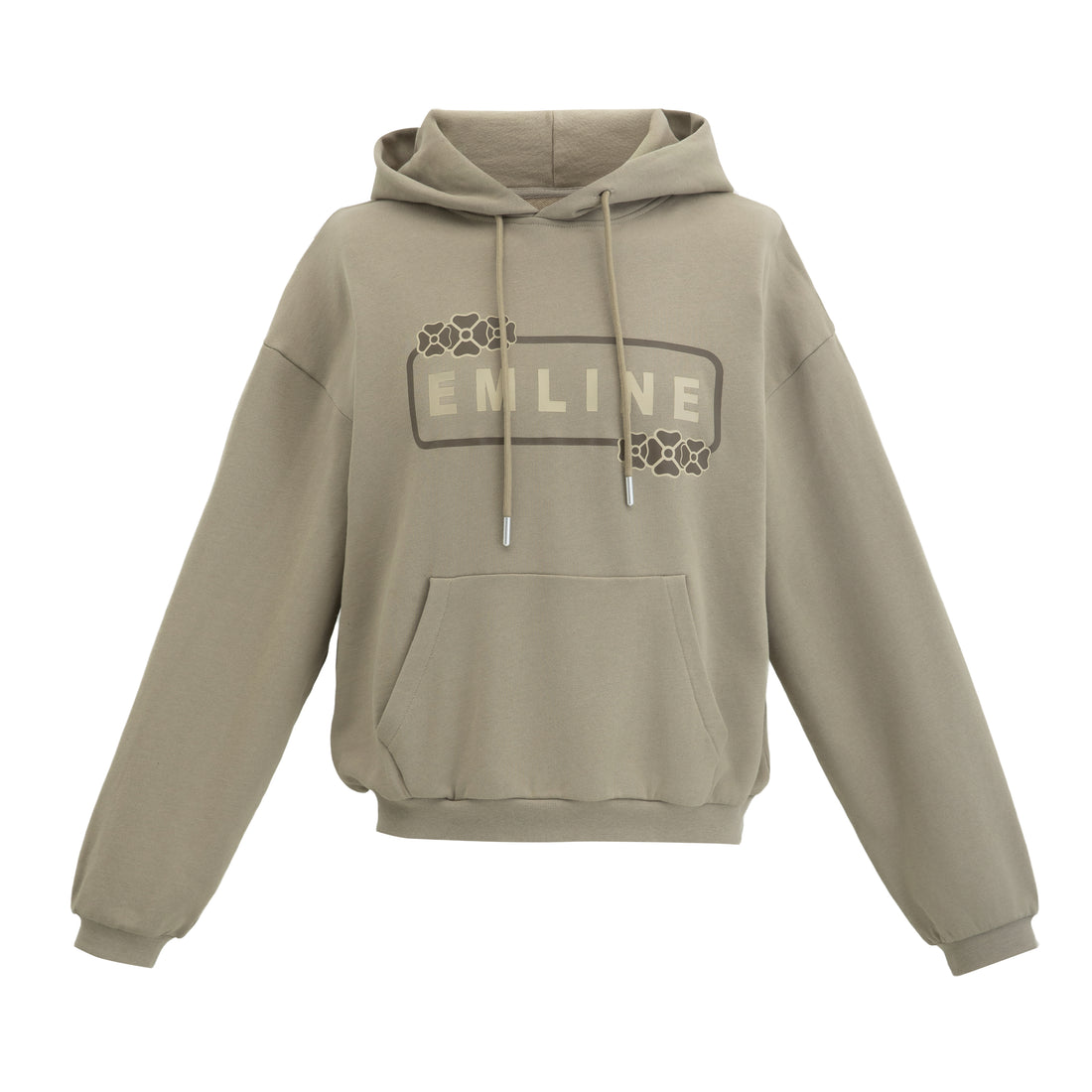 100% French Terry hoodie in taupe. Screen print at front and back in cream and...