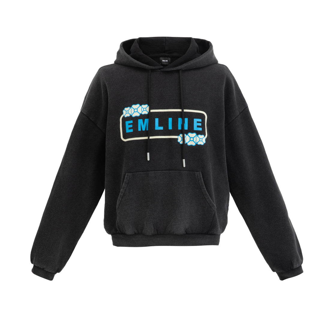 100% French Terry hoodie in vintage black. Screen print at front and back in cream...