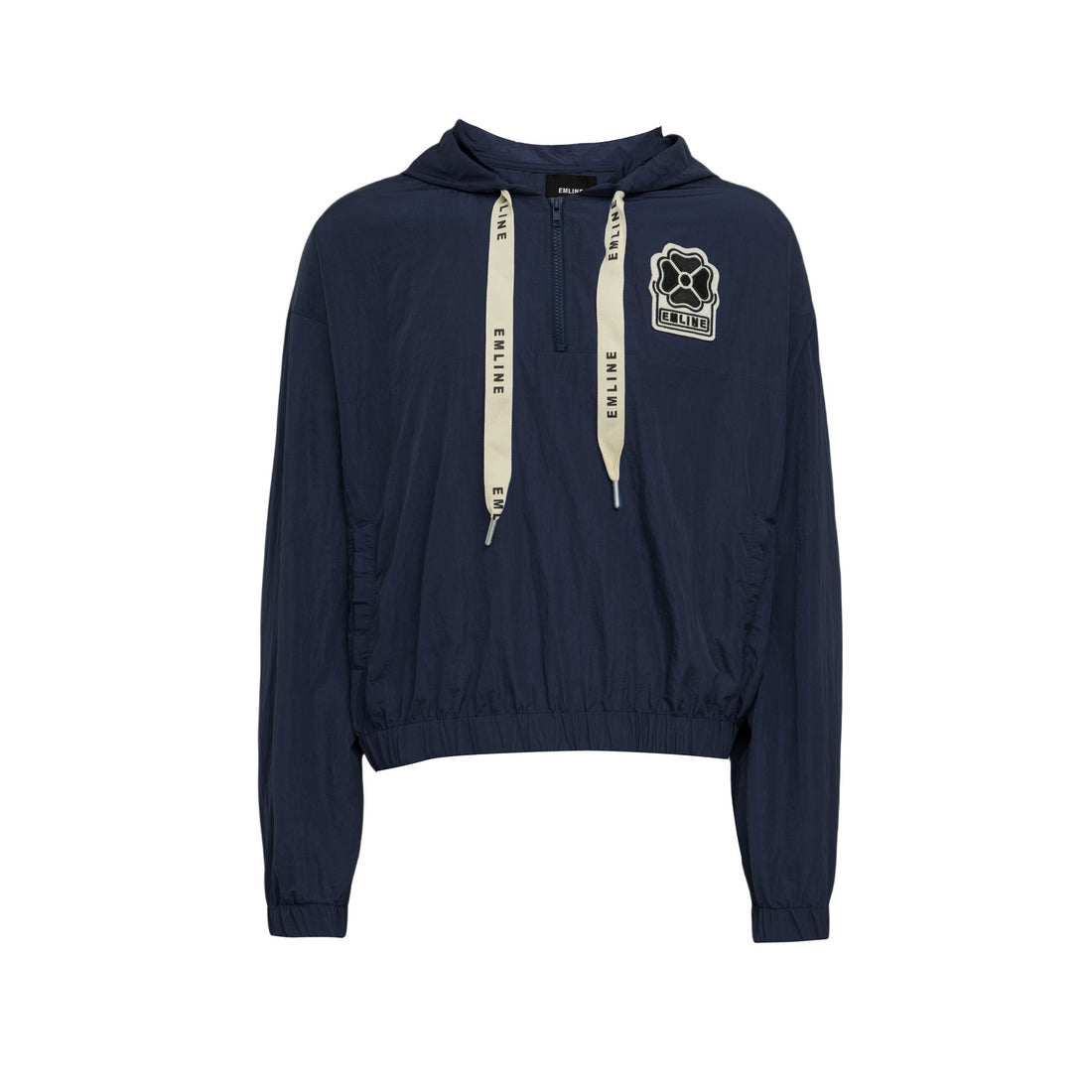 Half zip pull over long sleeve windbreaker top in navy. Zipper in navy. Logo...