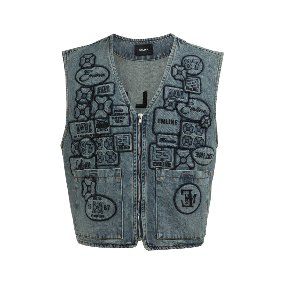 Light blue denim vest. Embroidery patches throughout in cream. Relaxed fit. Silver zipper at...
