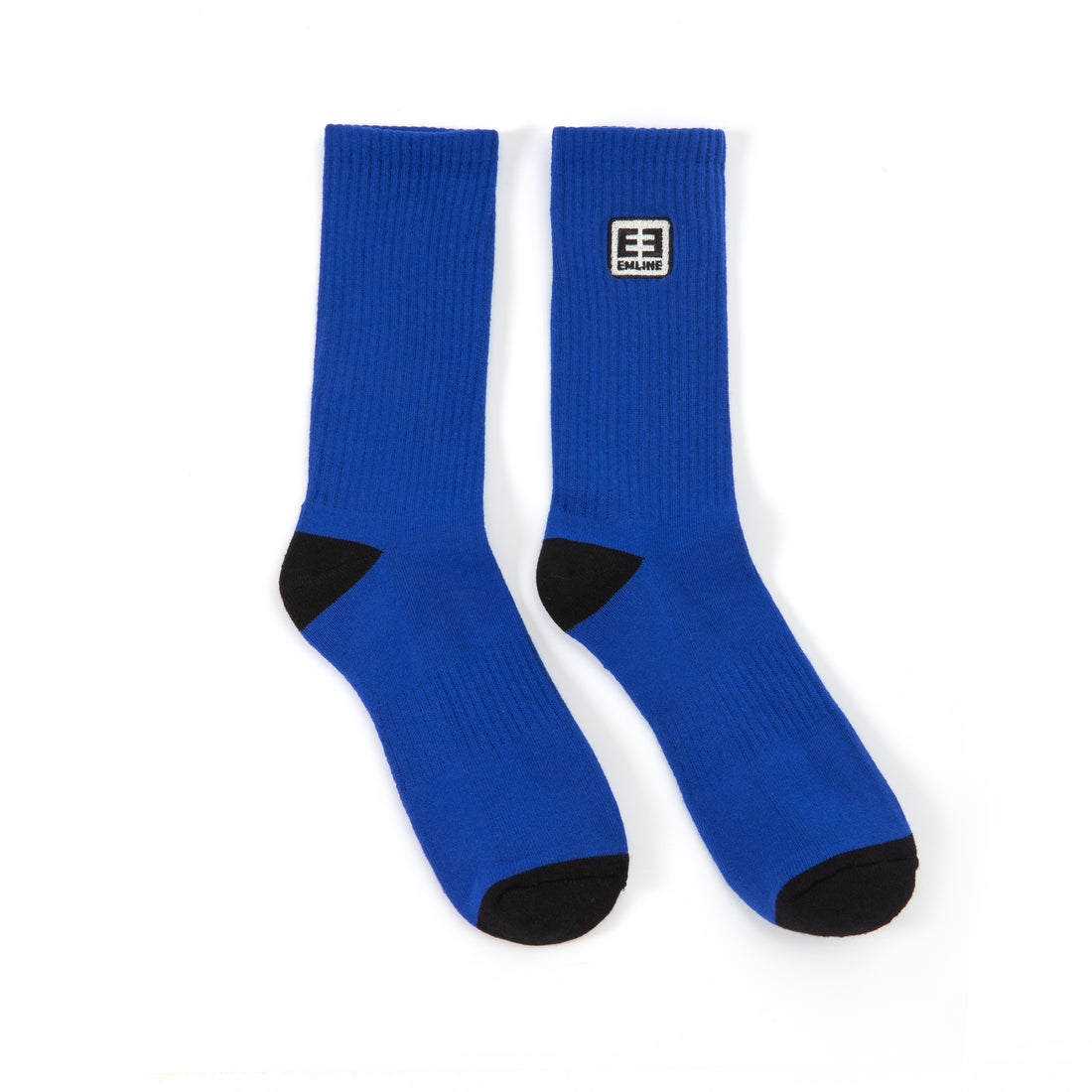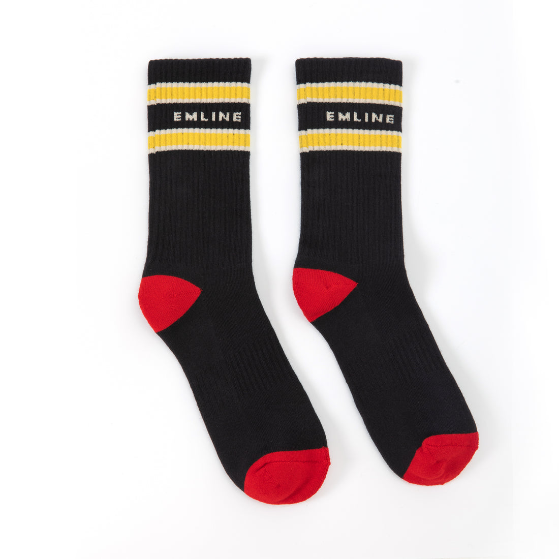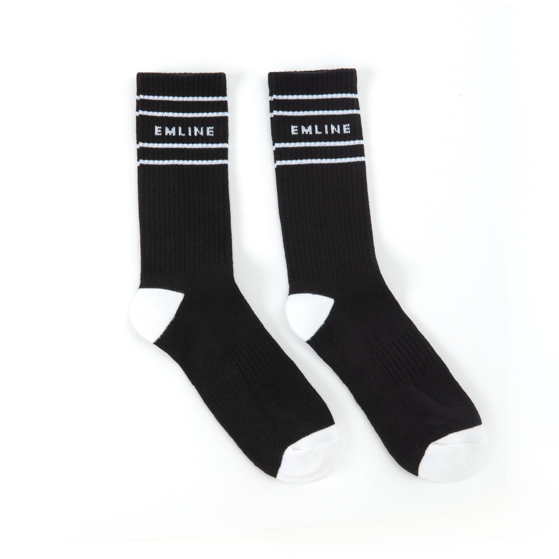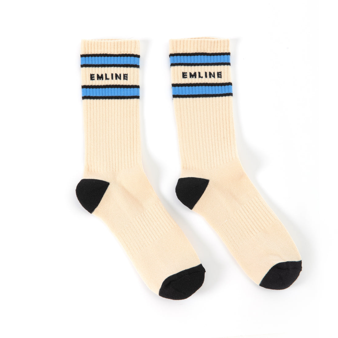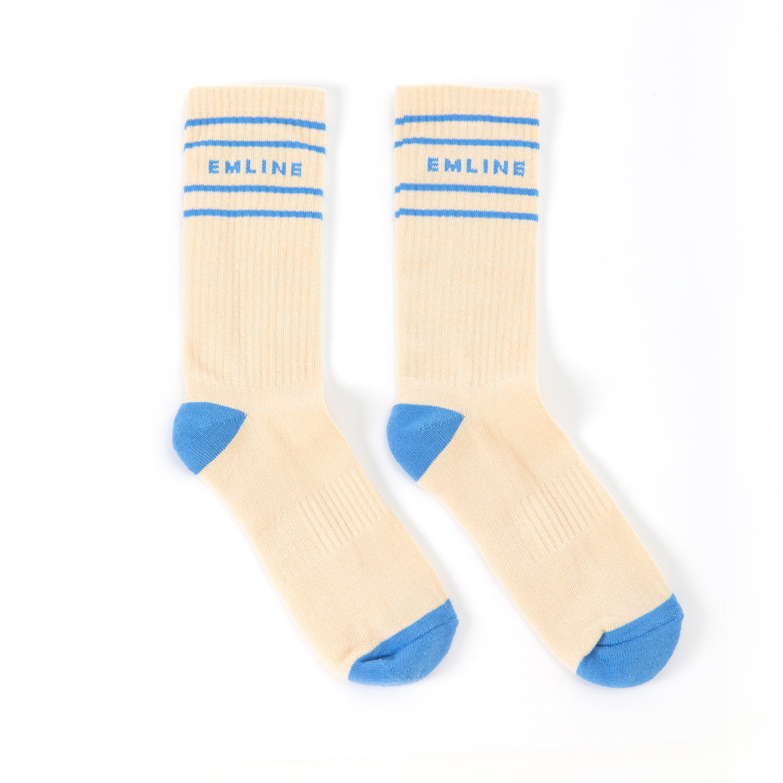Sports cotton tube socks in black and Columbia blue. Logo in cream with Columbia blue...