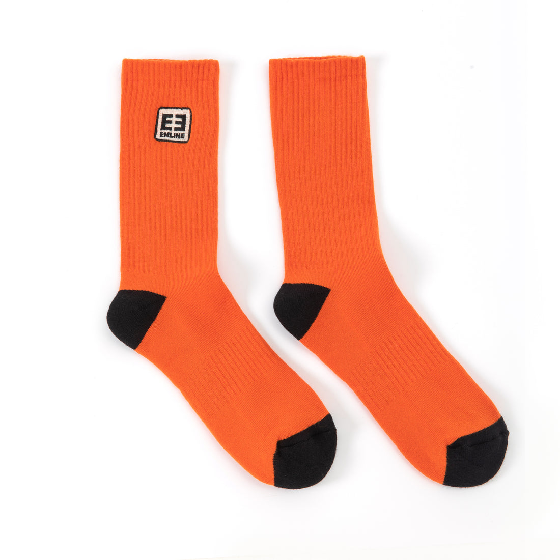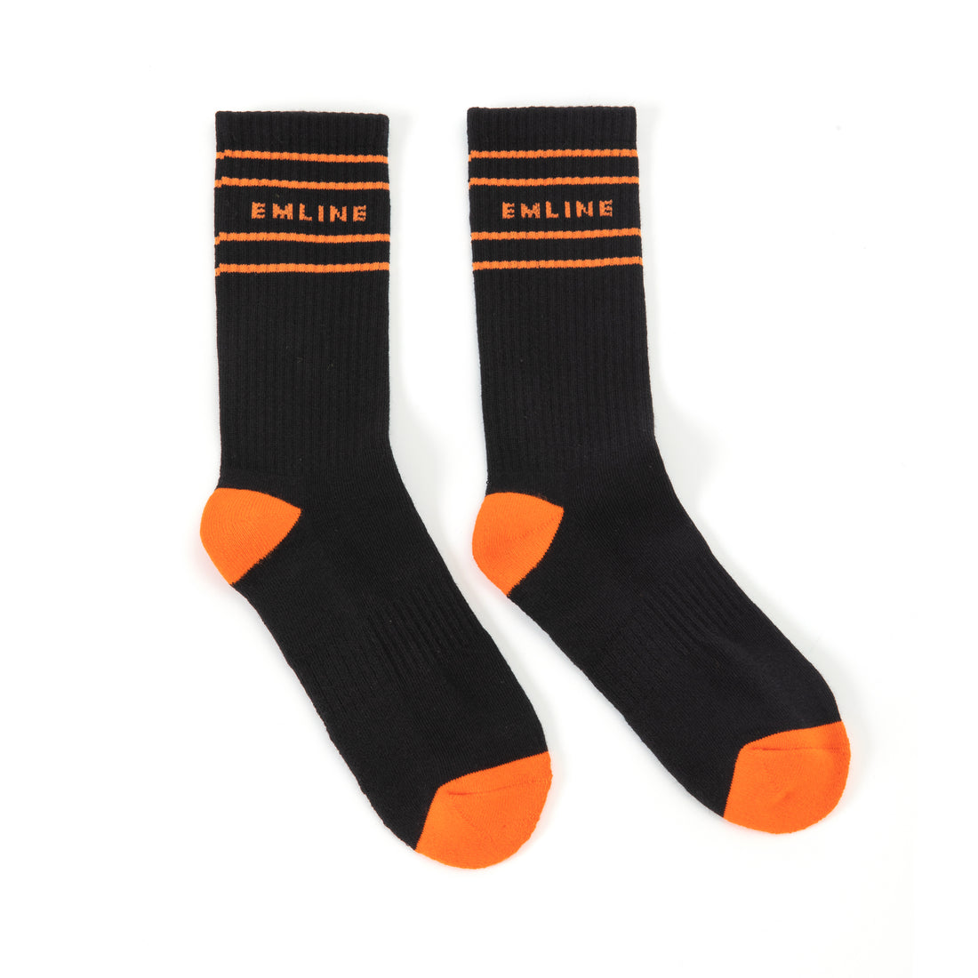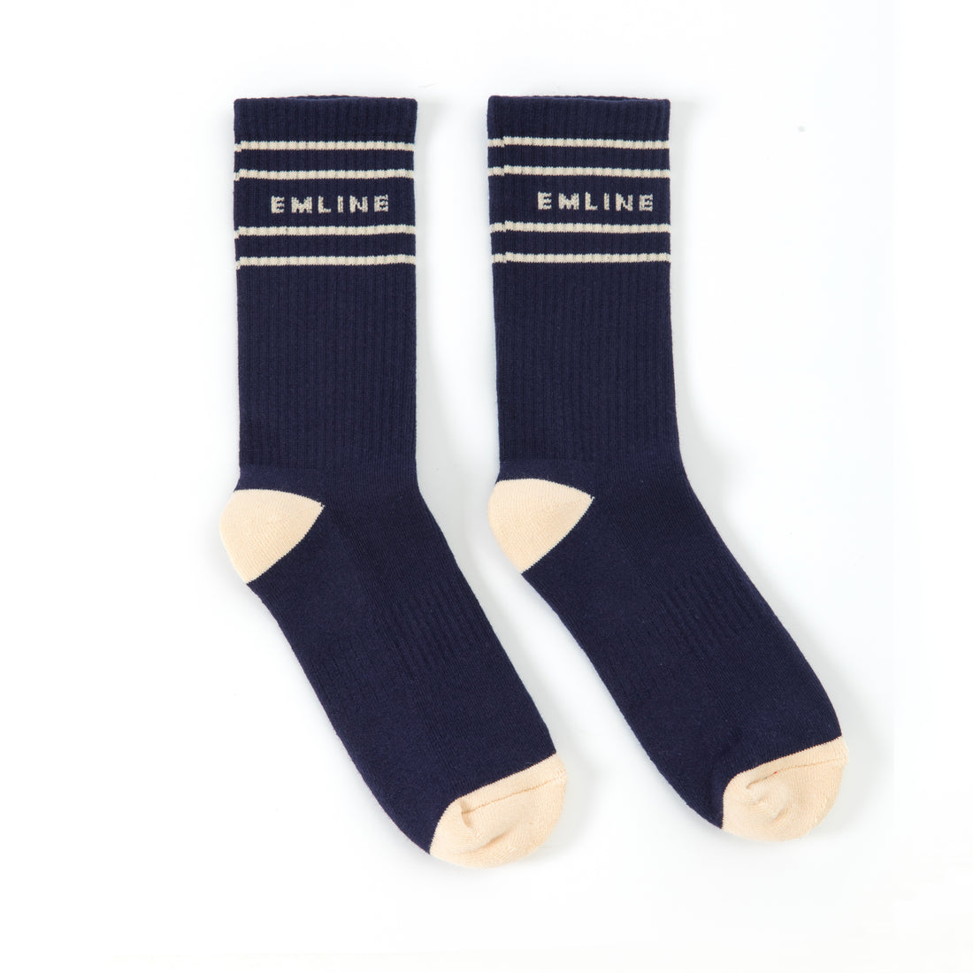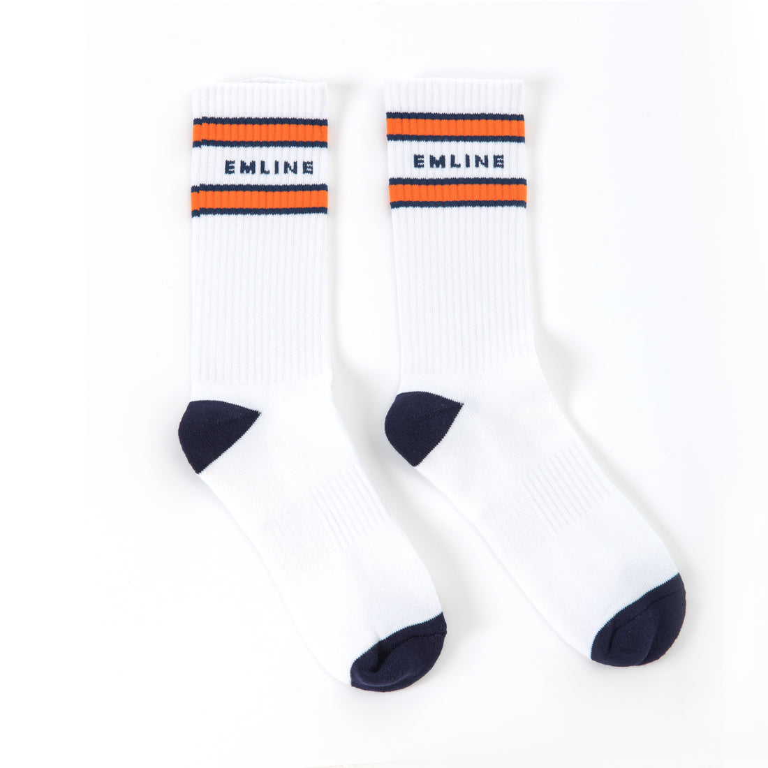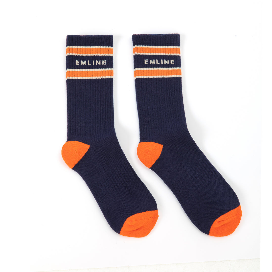 Sports cotton tube socks in navy and orange. Logo in cream with orange stripes at...