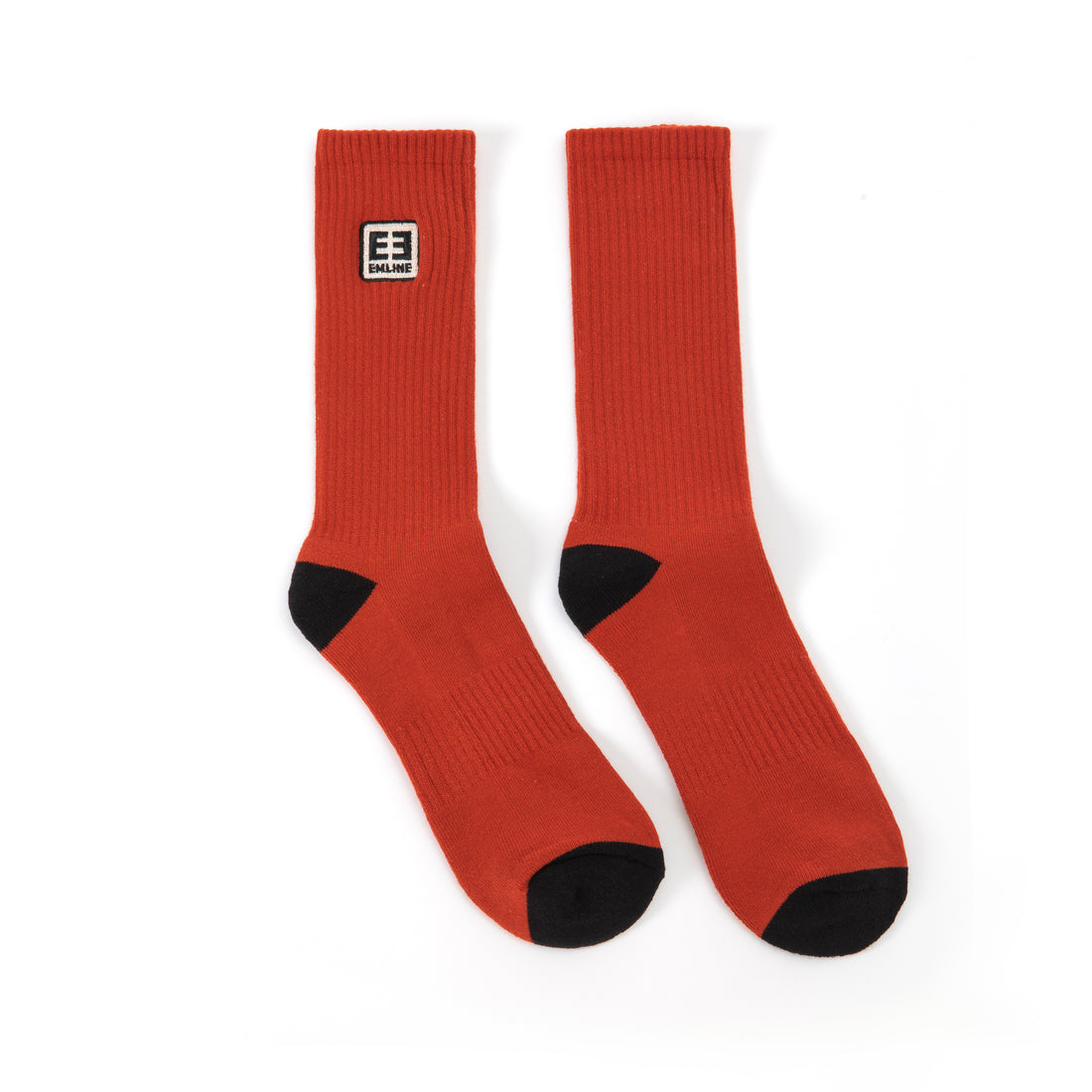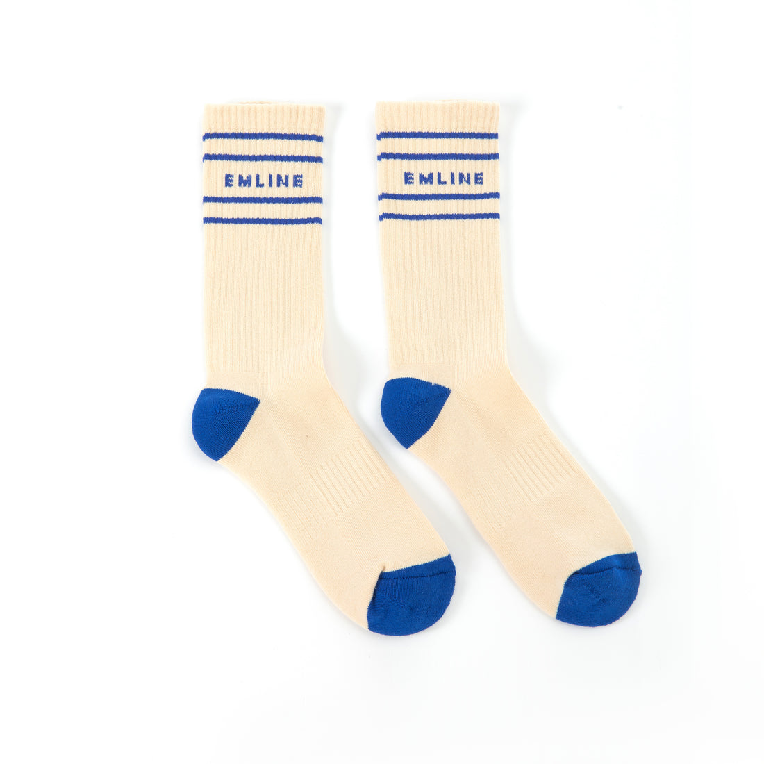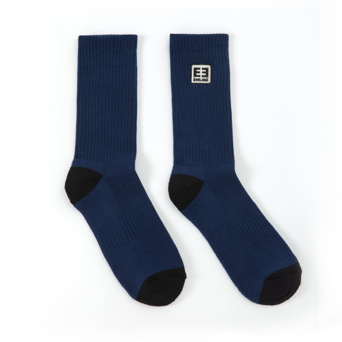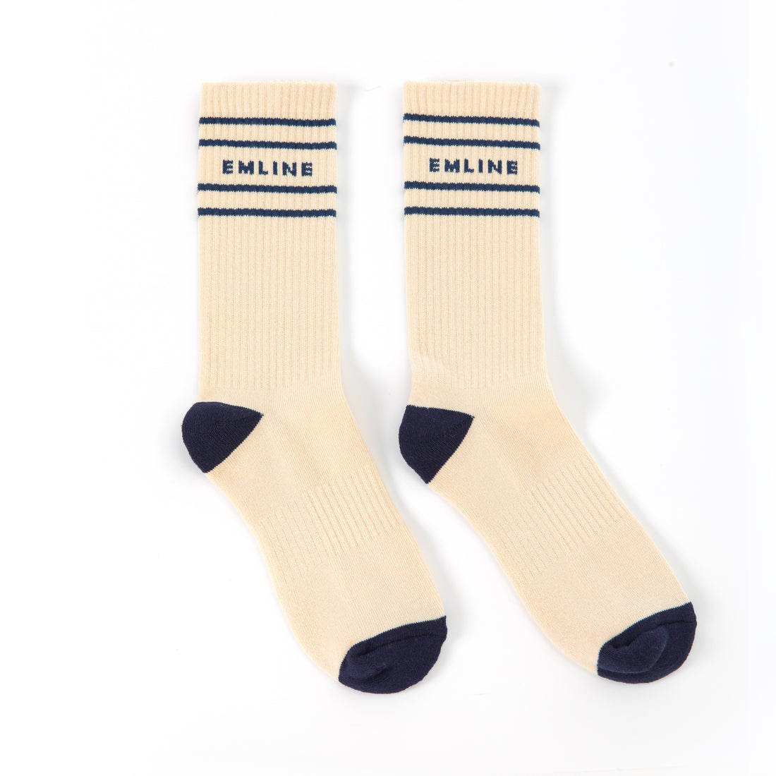 Sports cotton tube socks in navy and orange. Logo in cream with orange stripes at...