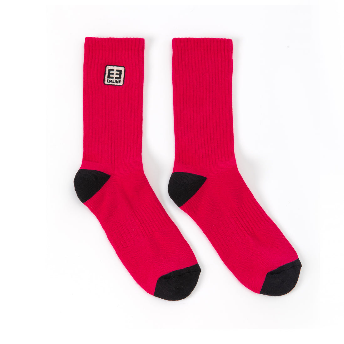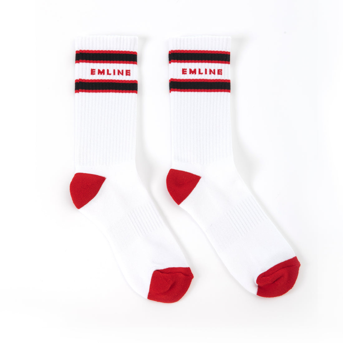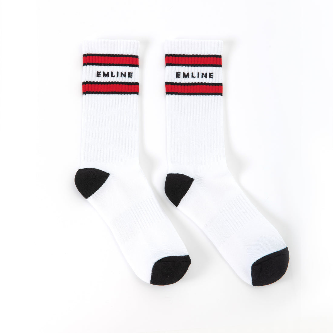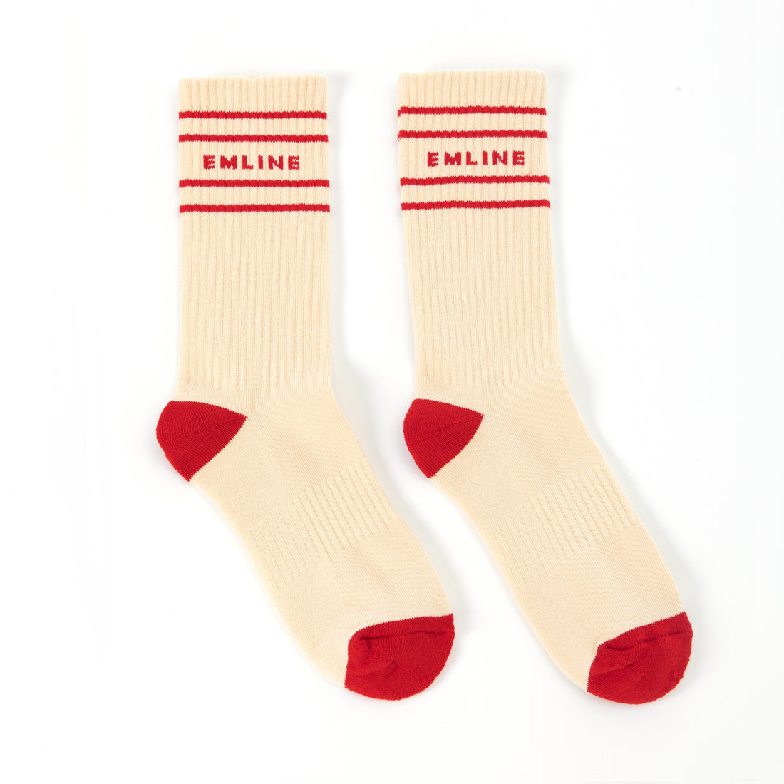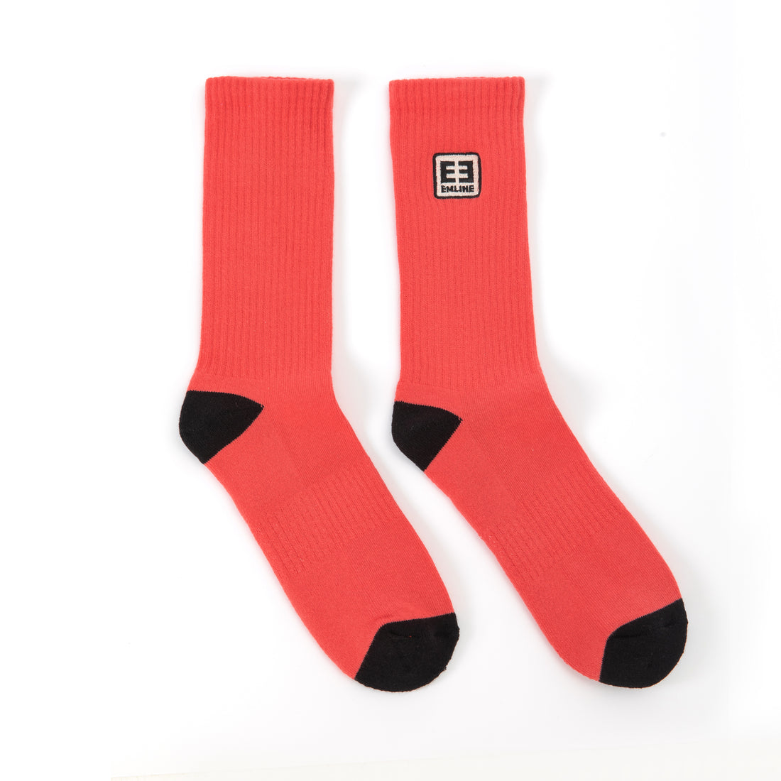 Sports cotton tube socks in navy and orange. Logo in cream with orange stripes at...