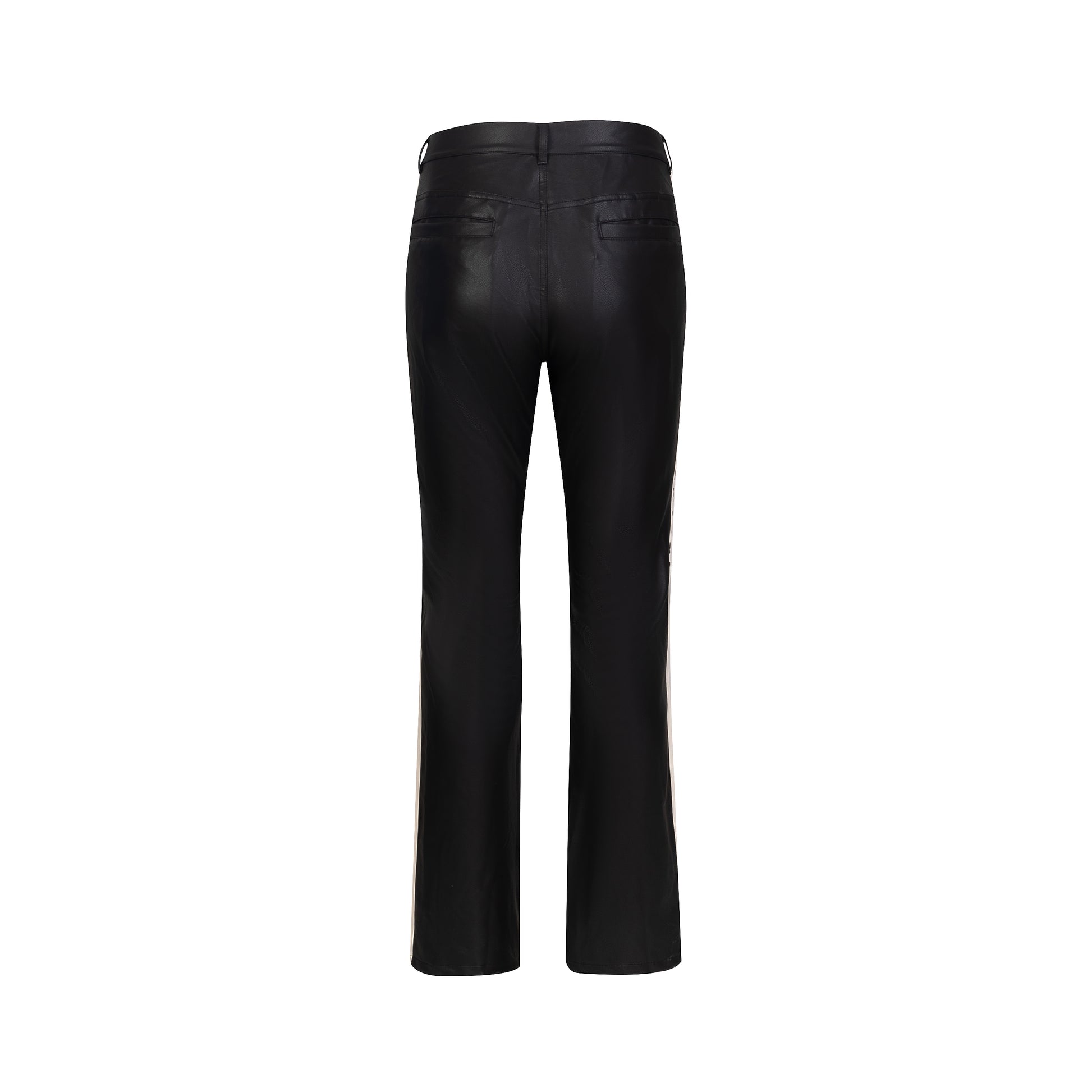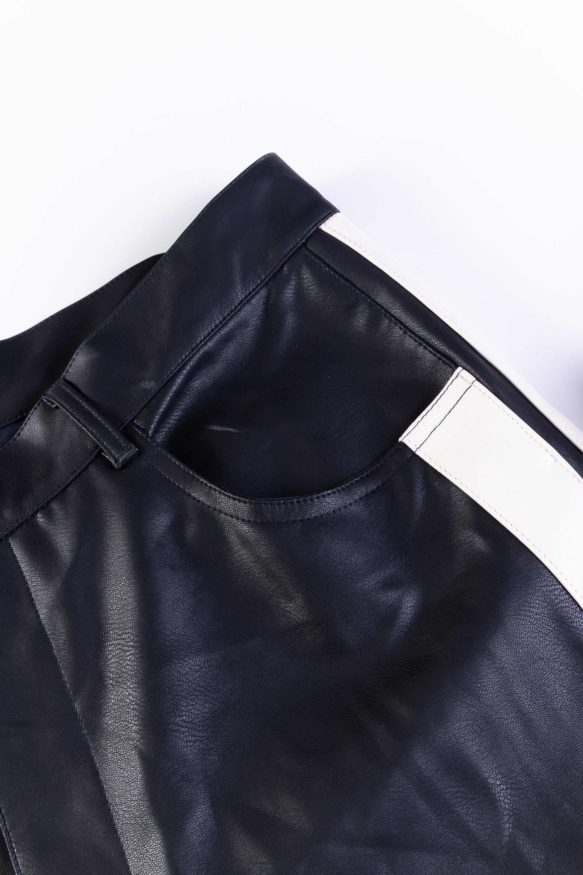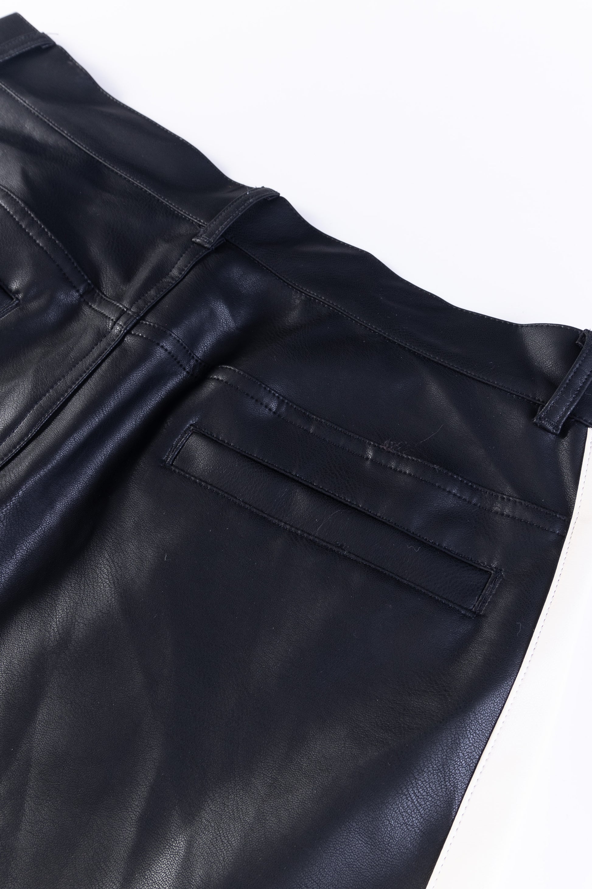 - Black faux leather pants.
