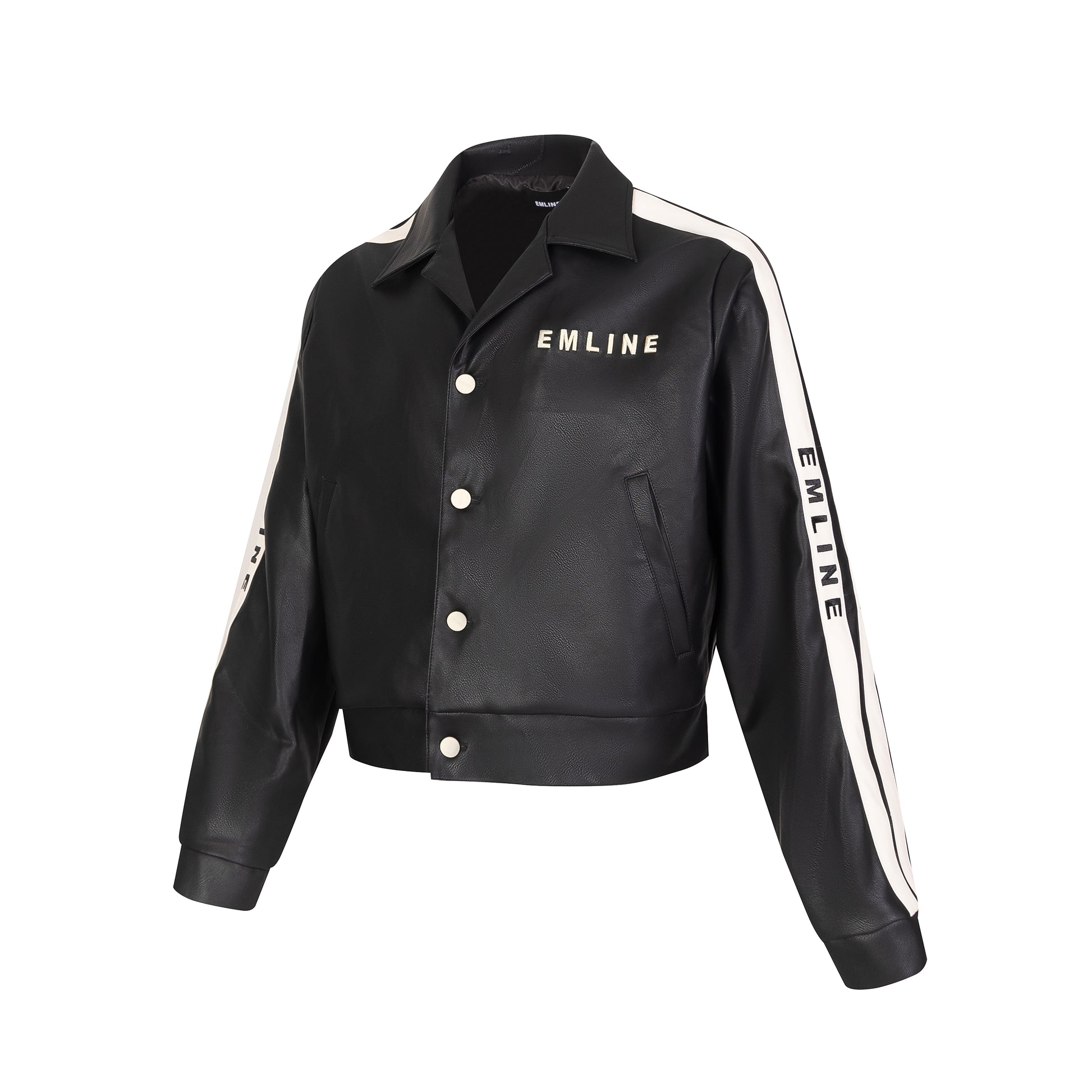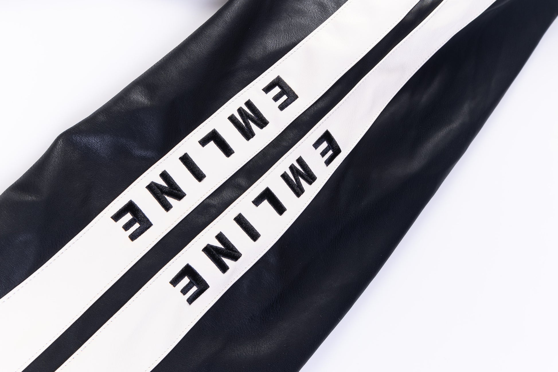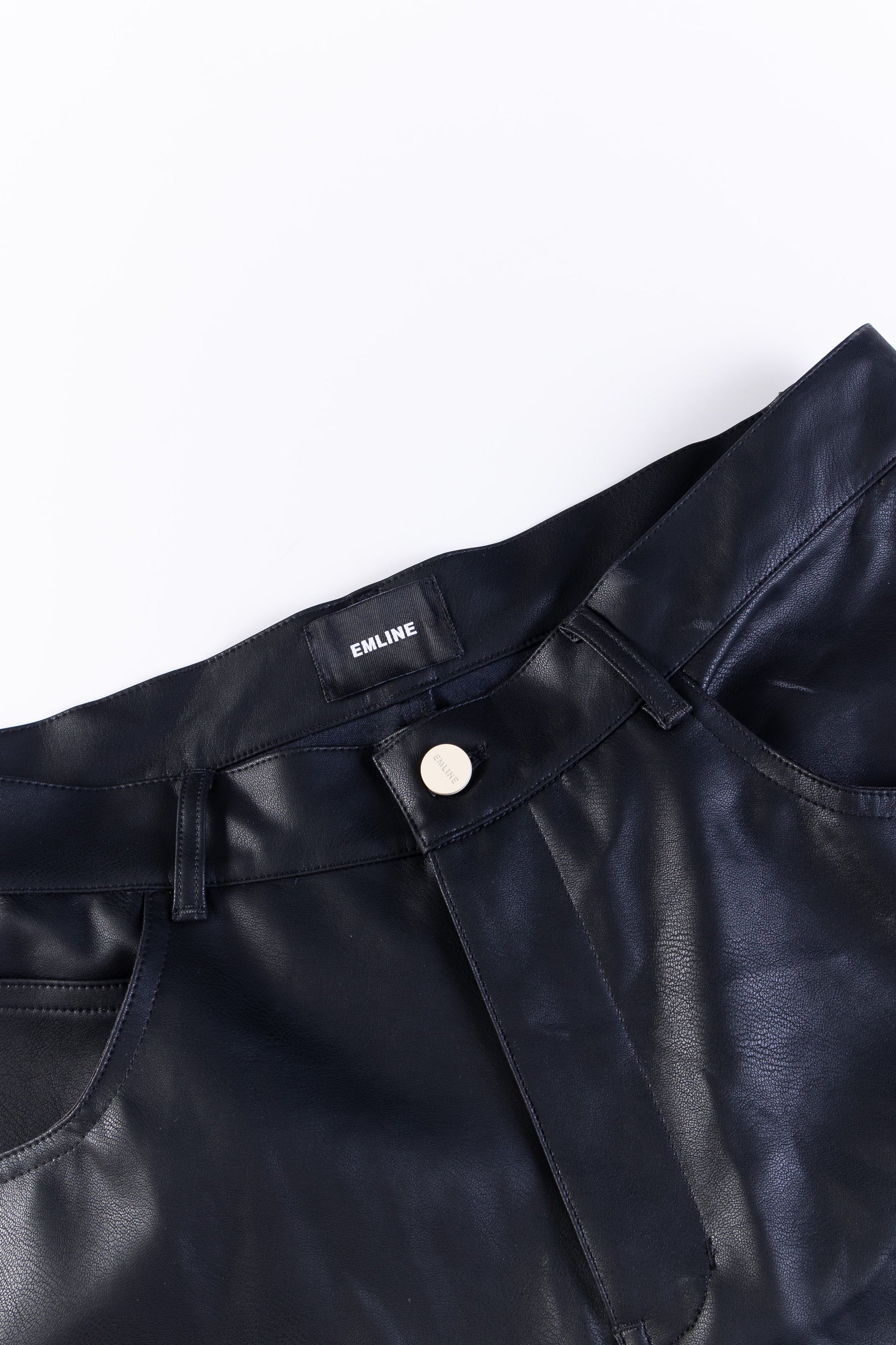 - Black faux leather pants.