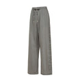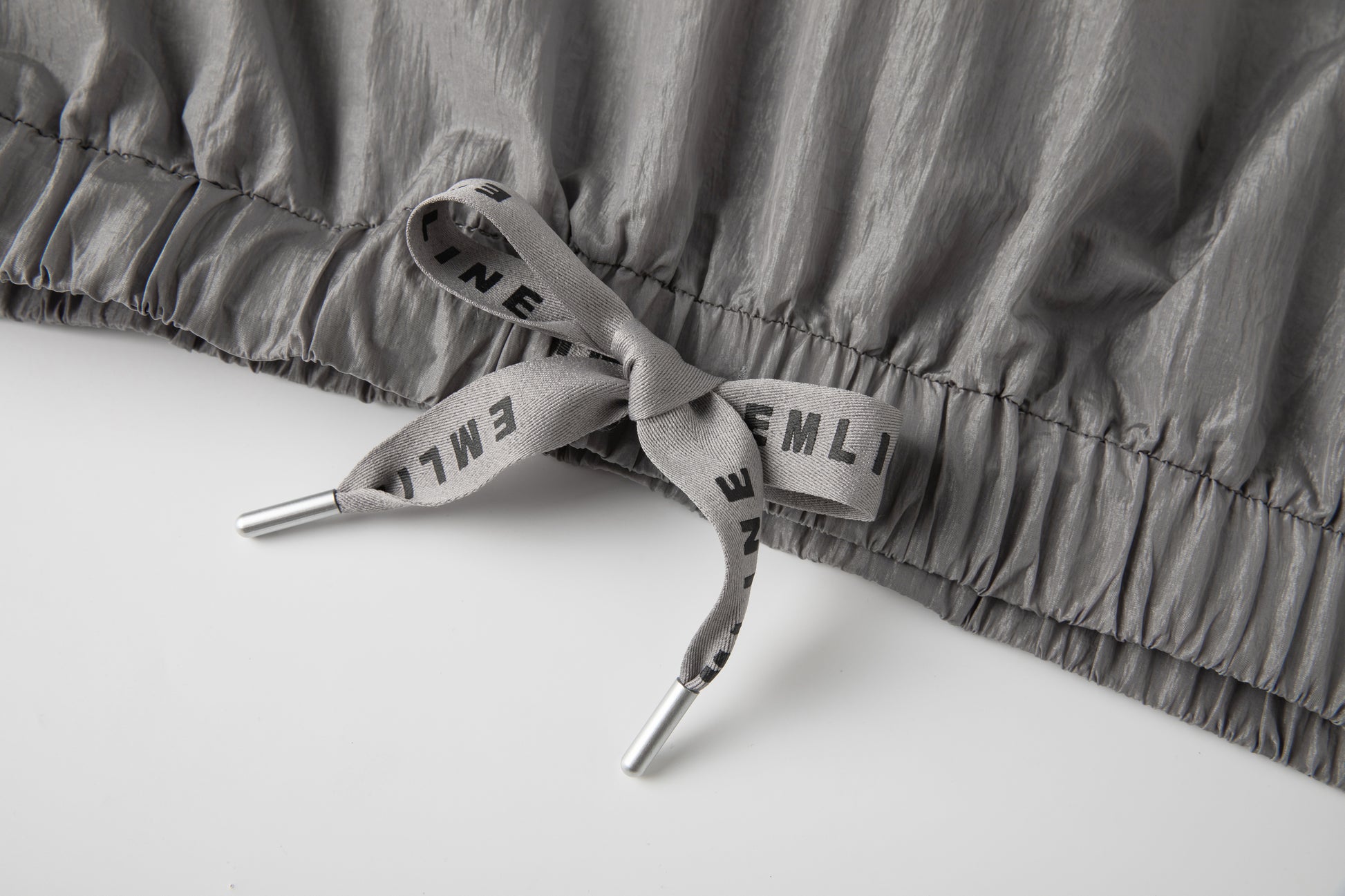 - Drawstring at waist in gray and black with logo tips.