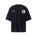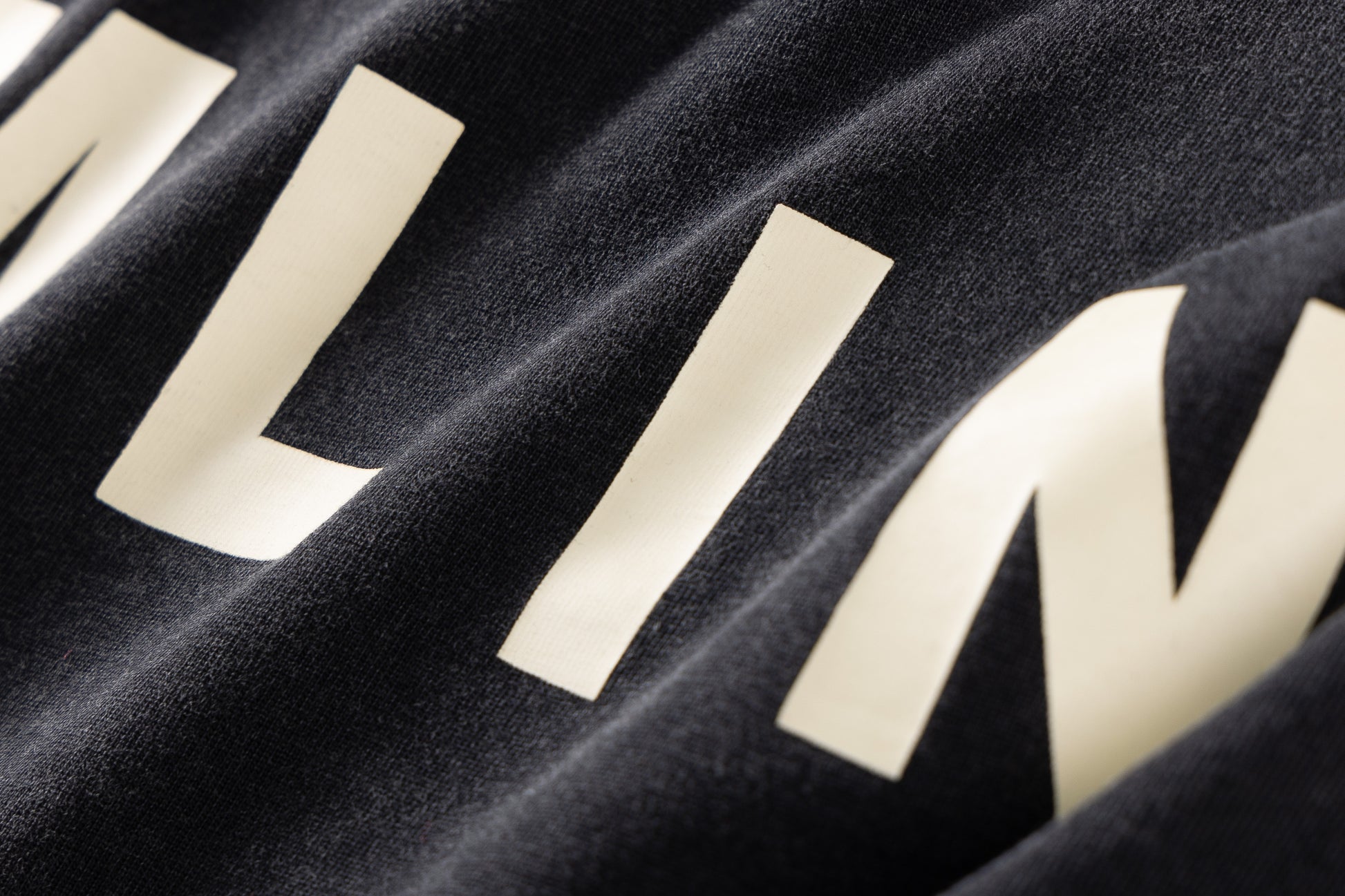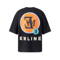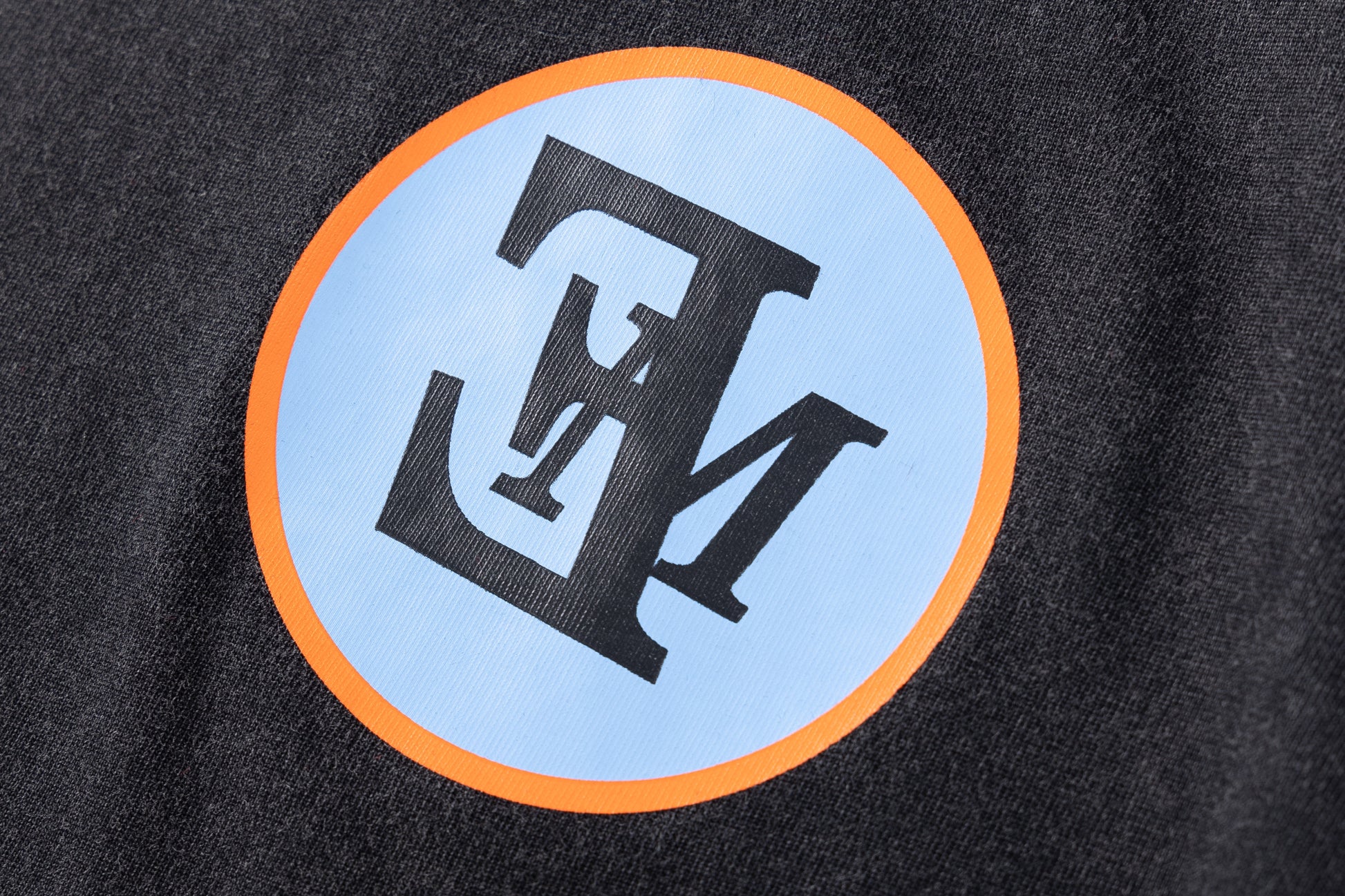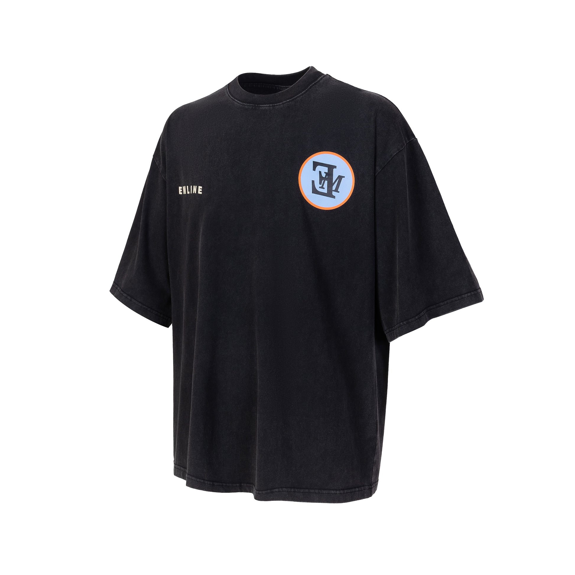 - Screenprint throughout in cream, black, blue, orange, and teal.