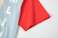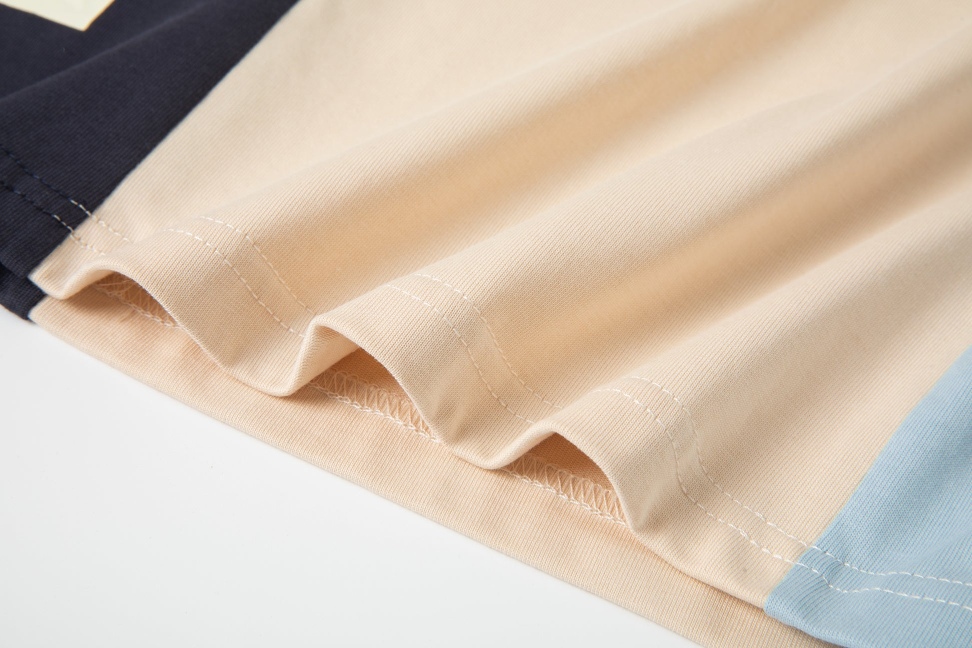 - Split panel at front and back in navy, khaki, and light blue.