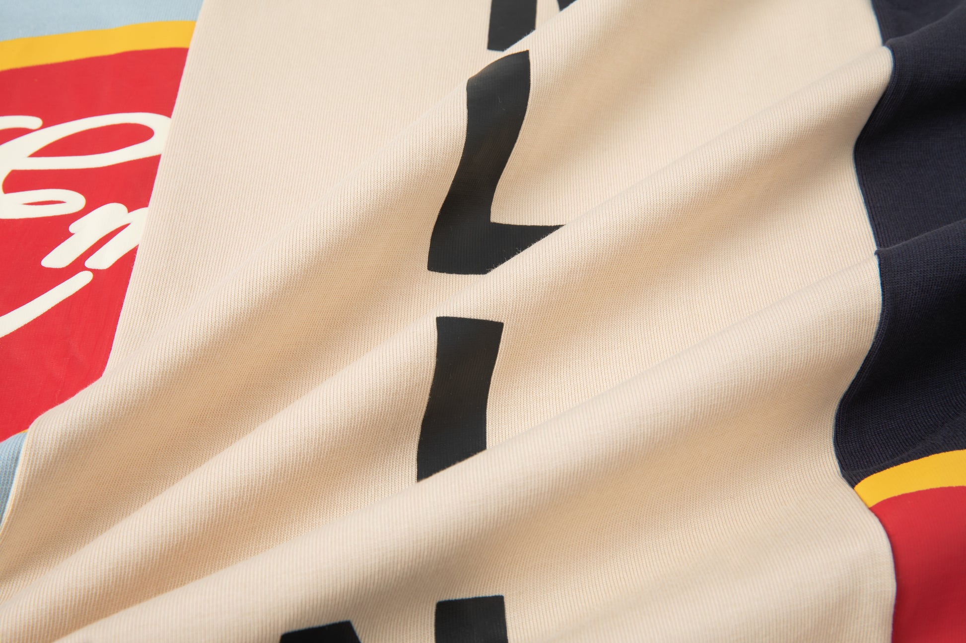 - Screen print throughout in cream, black, red, yellow.