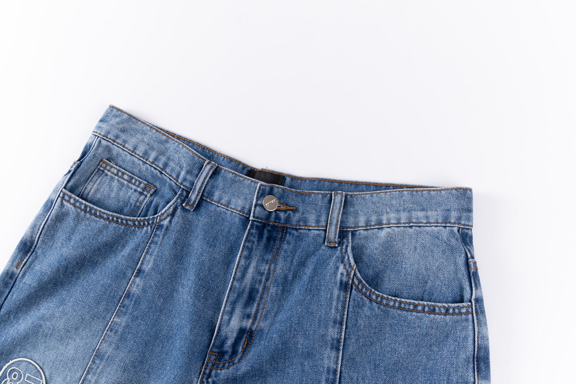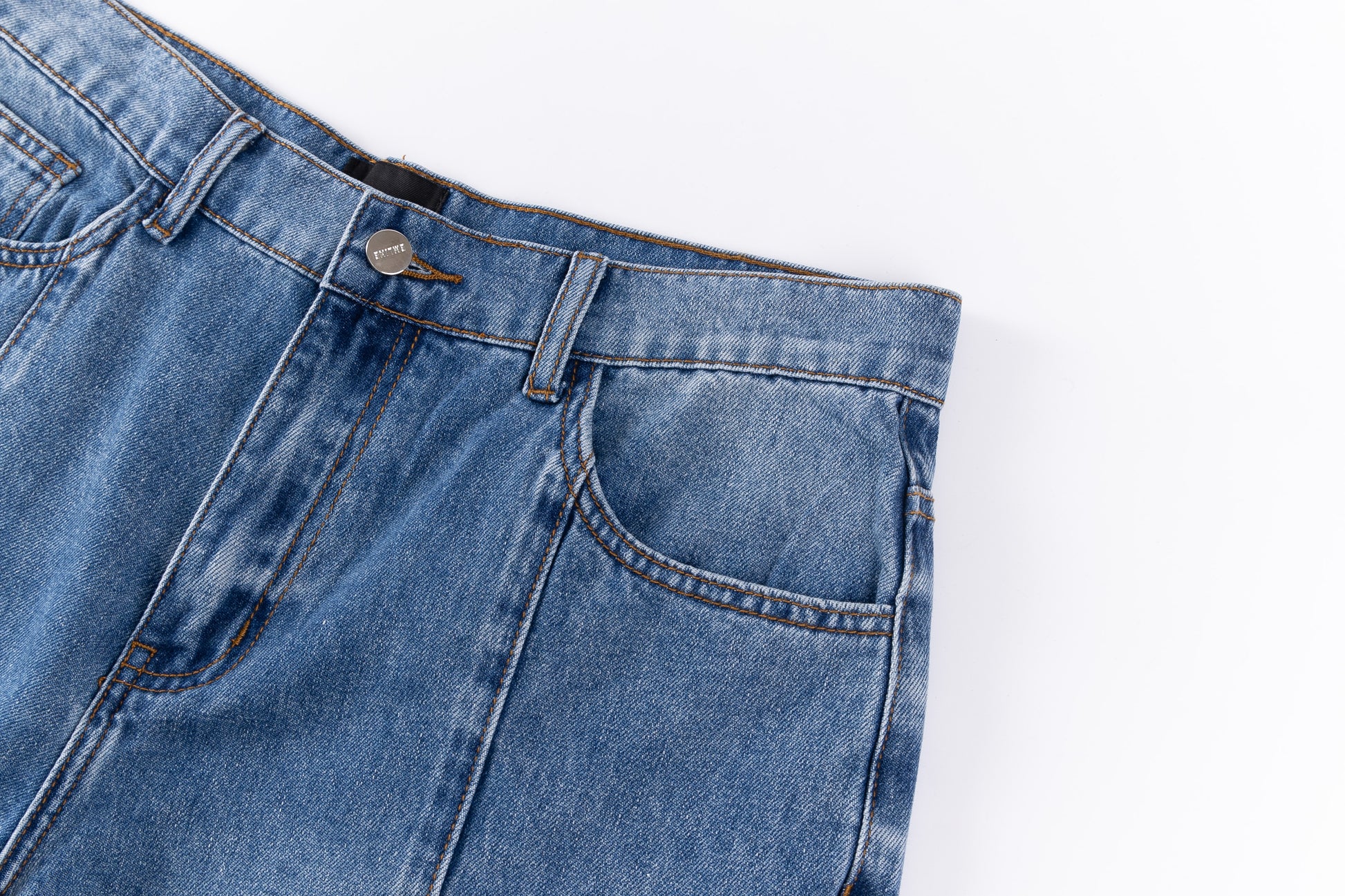- Silver single button and zipper fly.