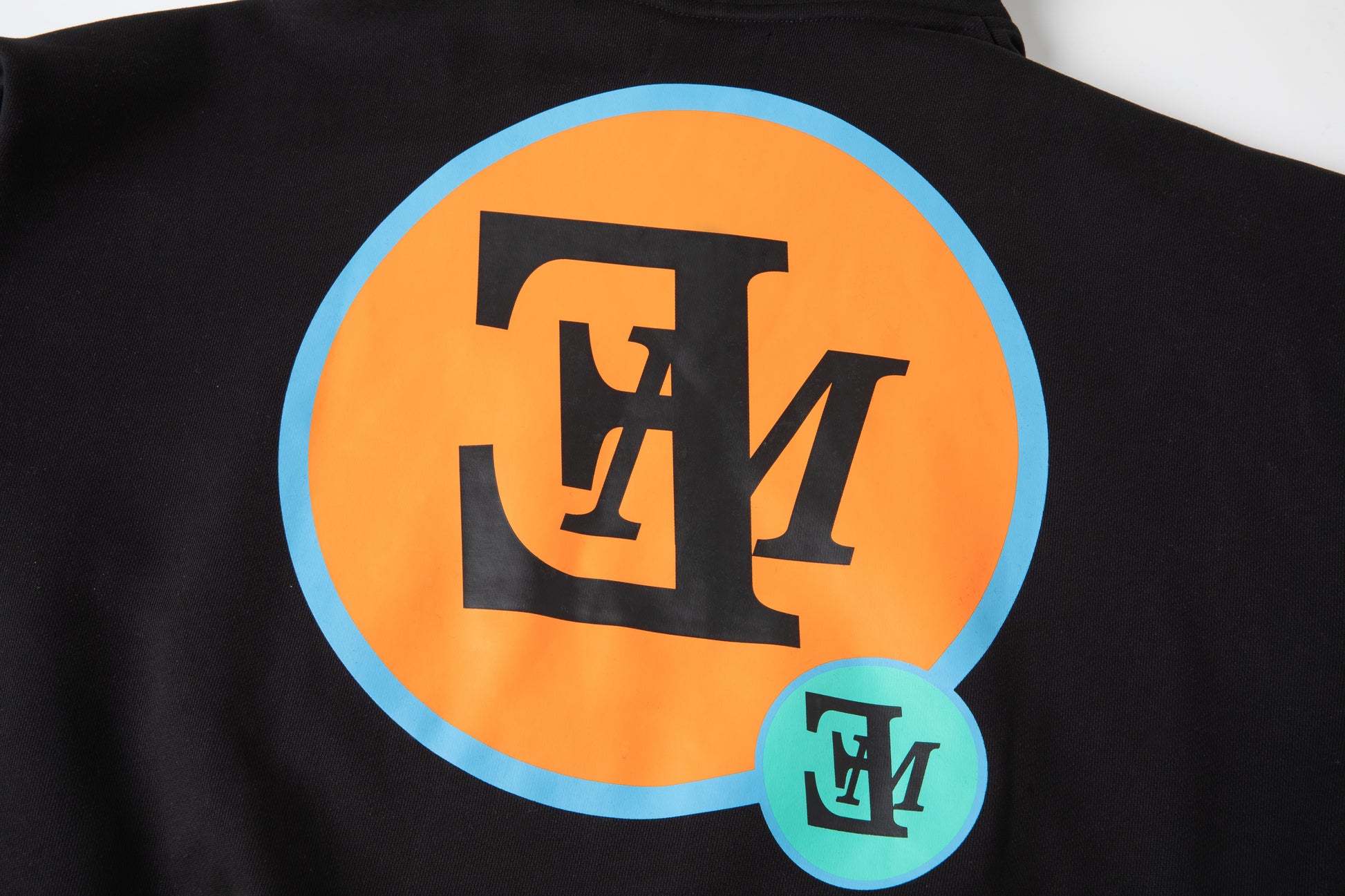 - Screen print at back in black, orange, cream, blue, and teal.