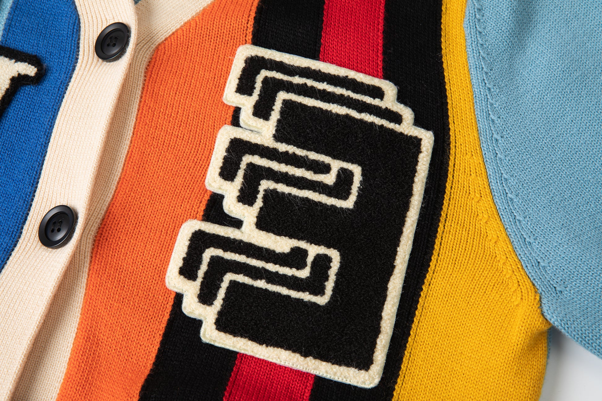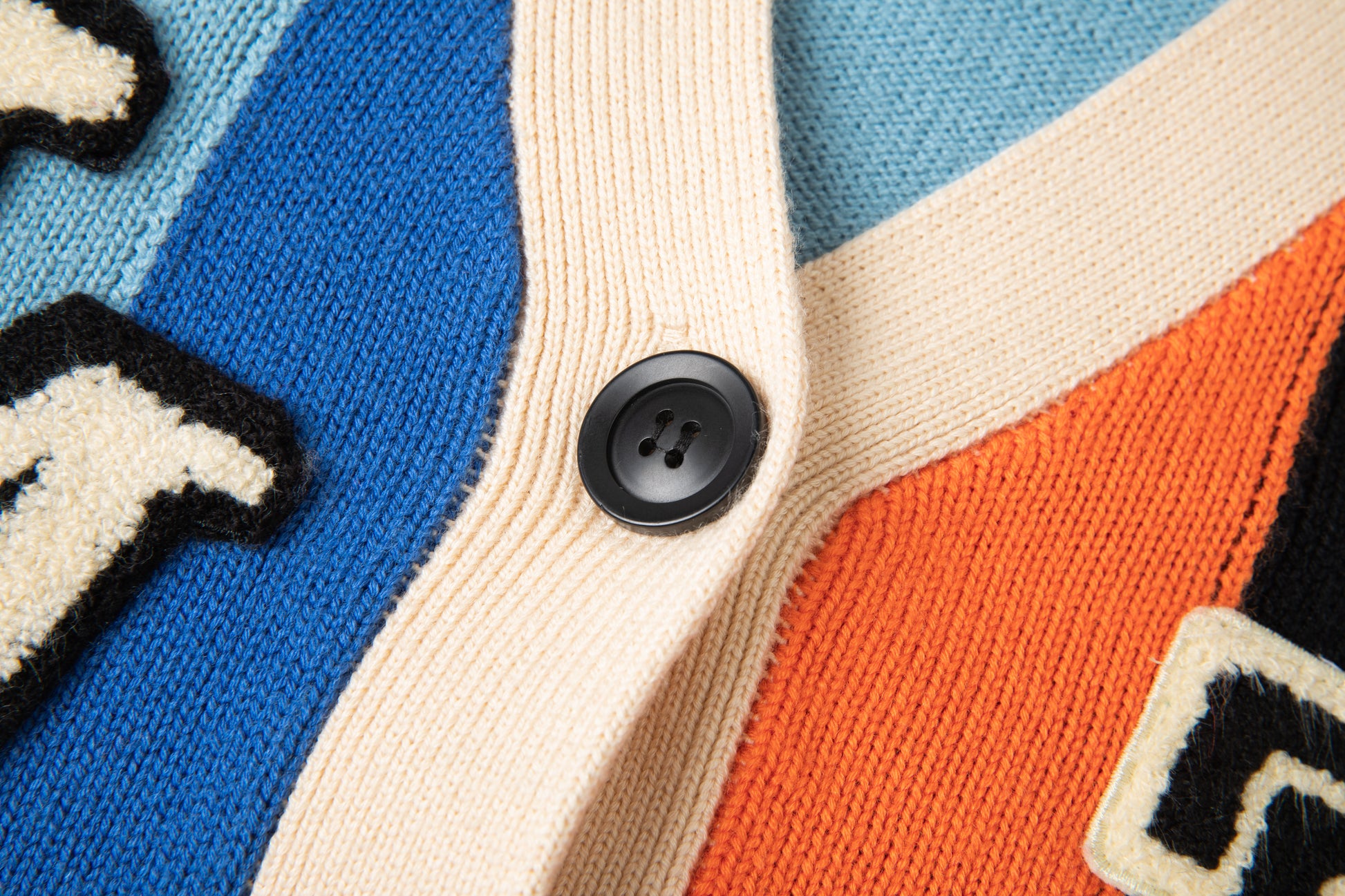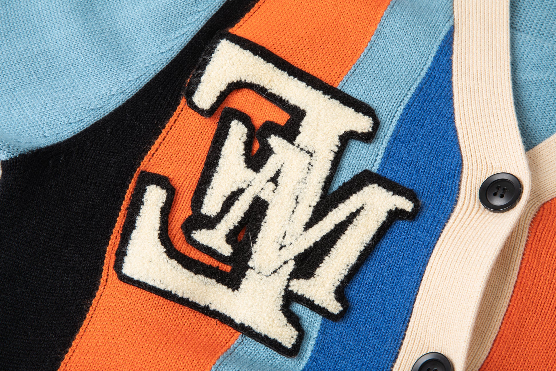 - Chenille logo patches at right and left chest in black and cream.