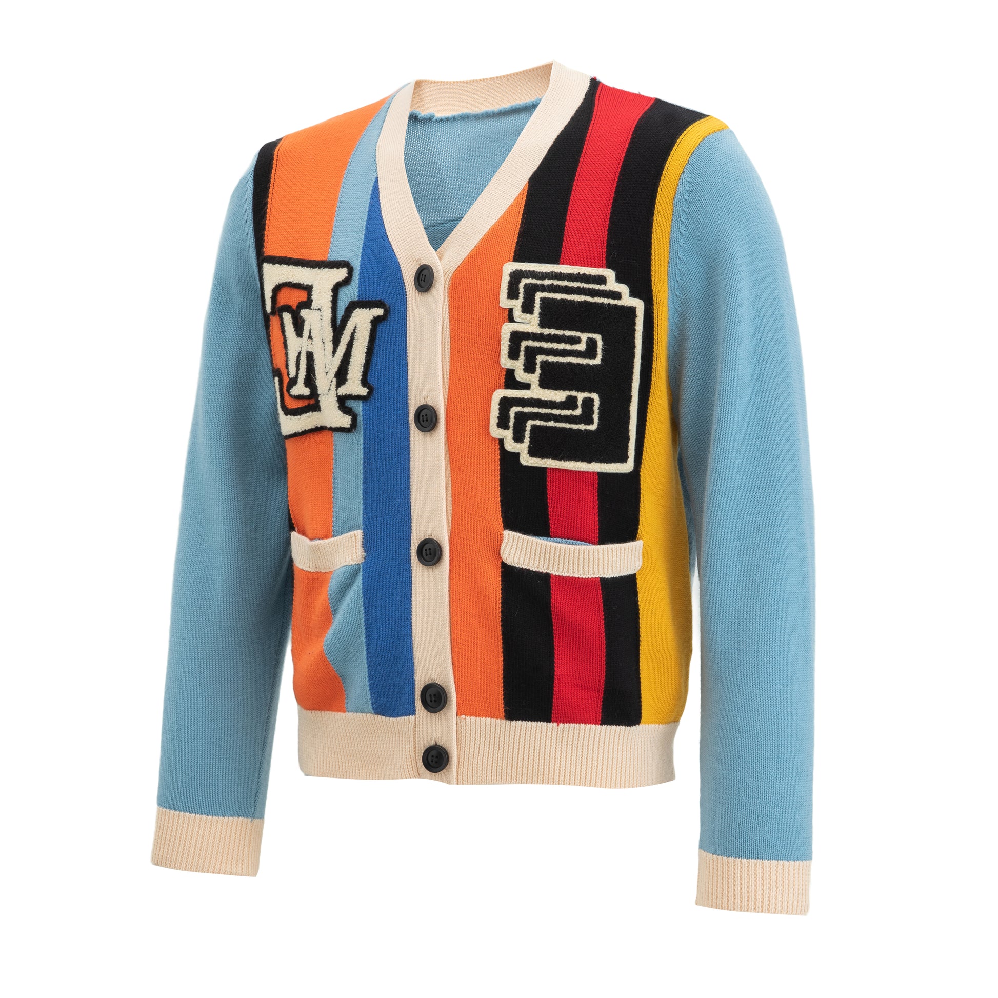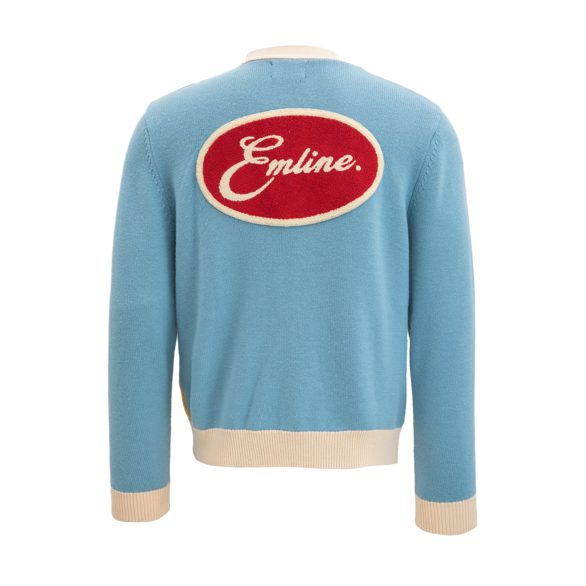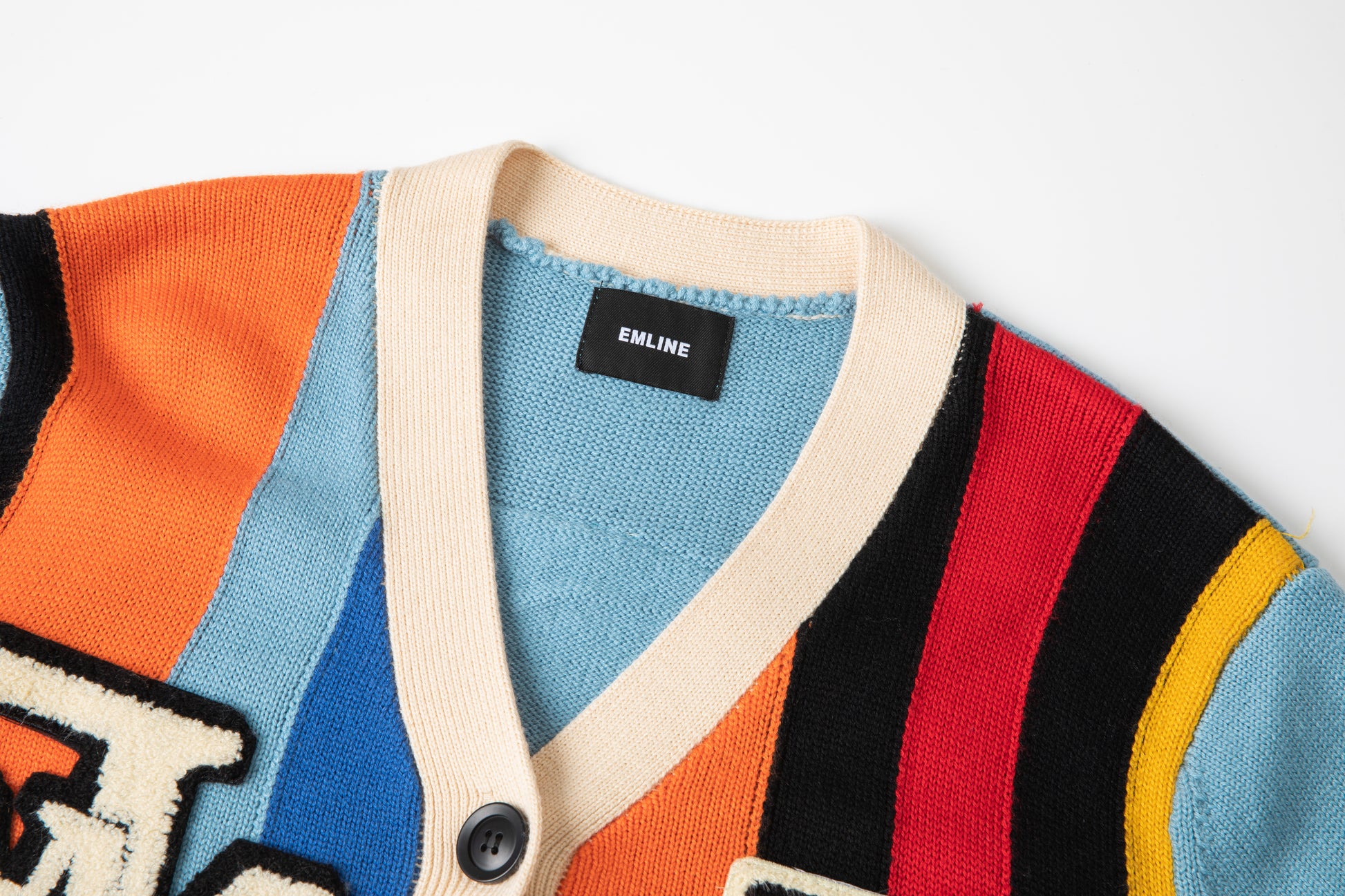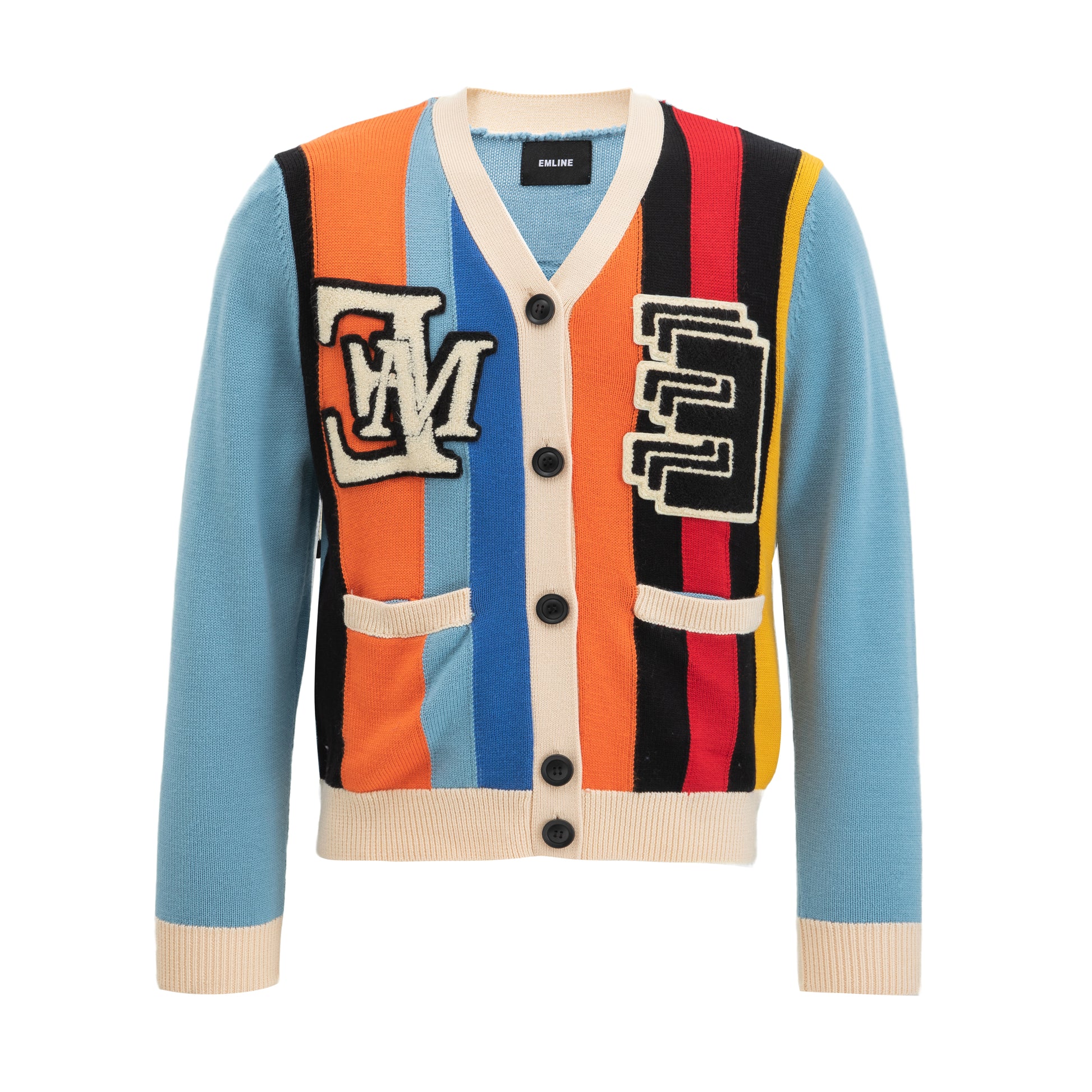 - Chenille logo patches at right and left chest in black and cream.