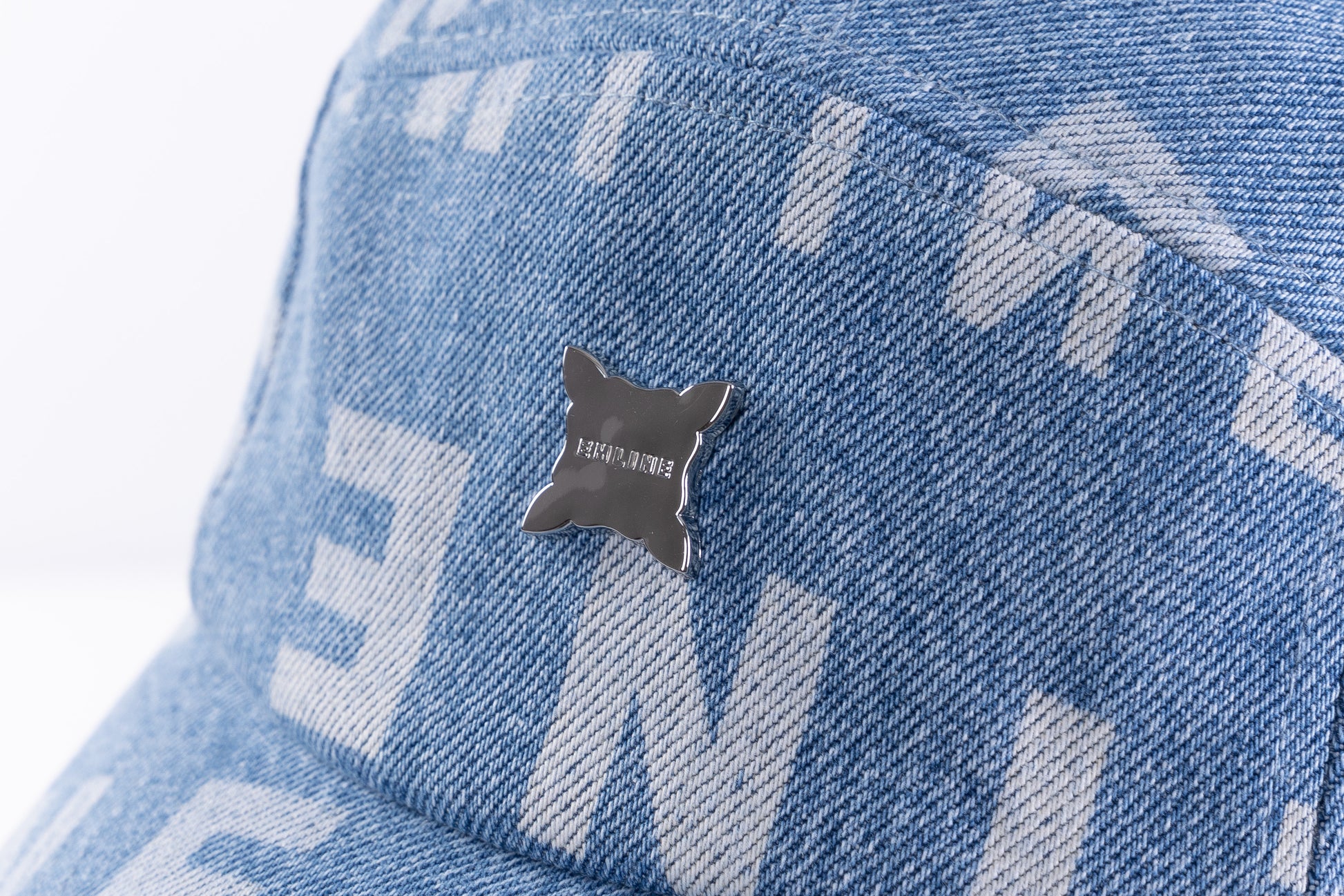 - Denim 5 panel hat in blue.