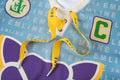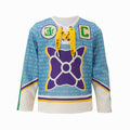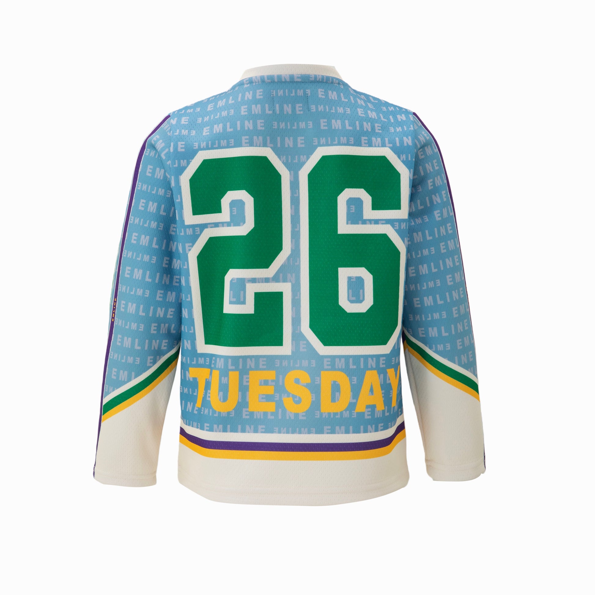 - Drawstring at neck in yellow and purple.