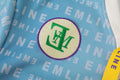 - Embroidery patches at left and right chest in cream and green.