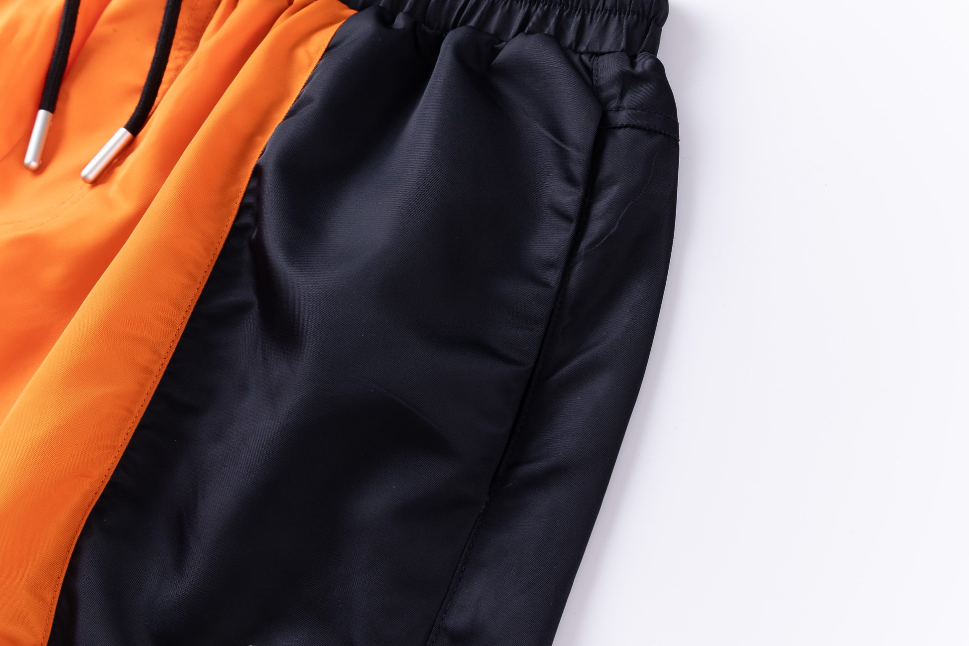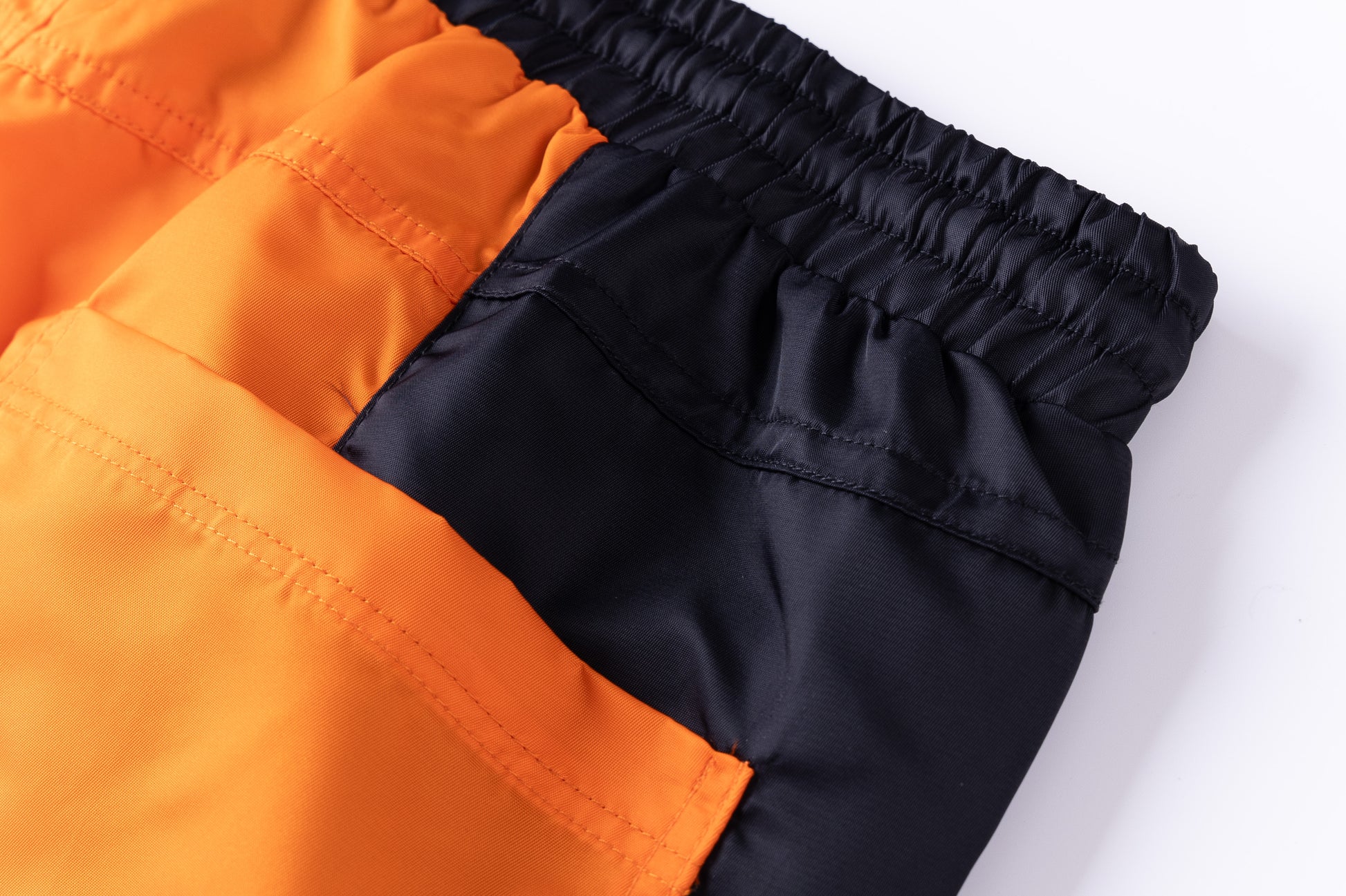 - Two tone satin jogging pants in black and orange.