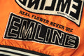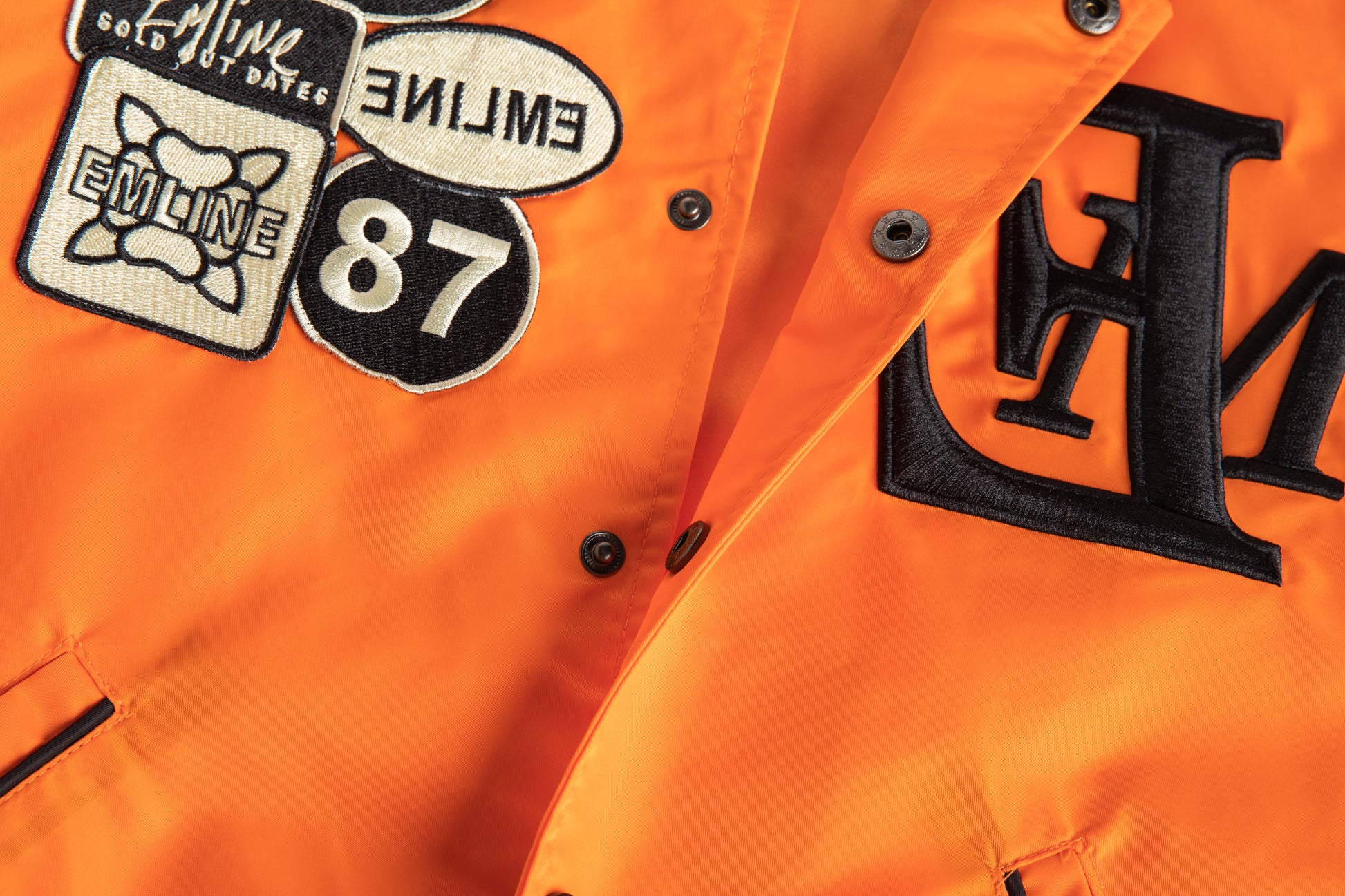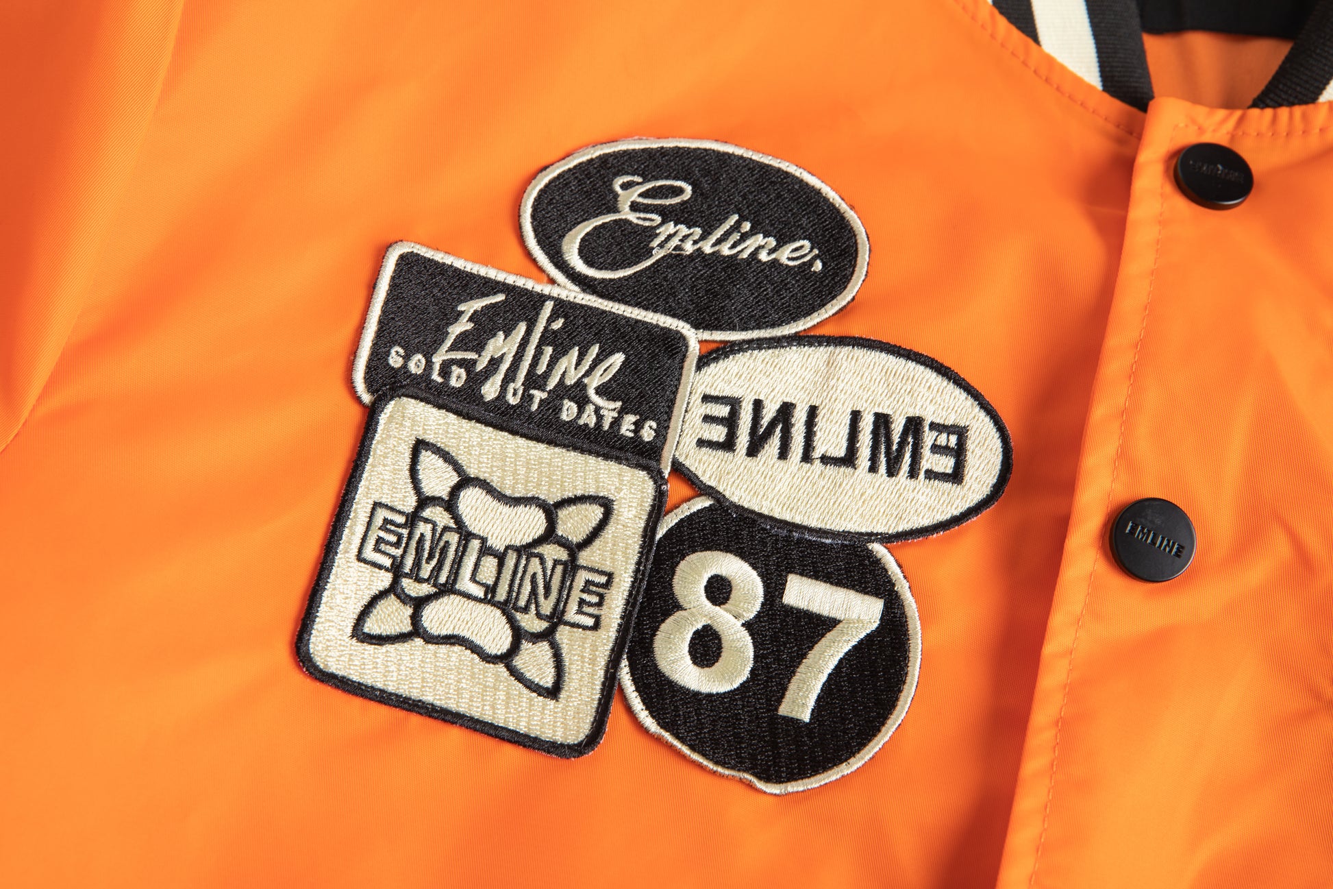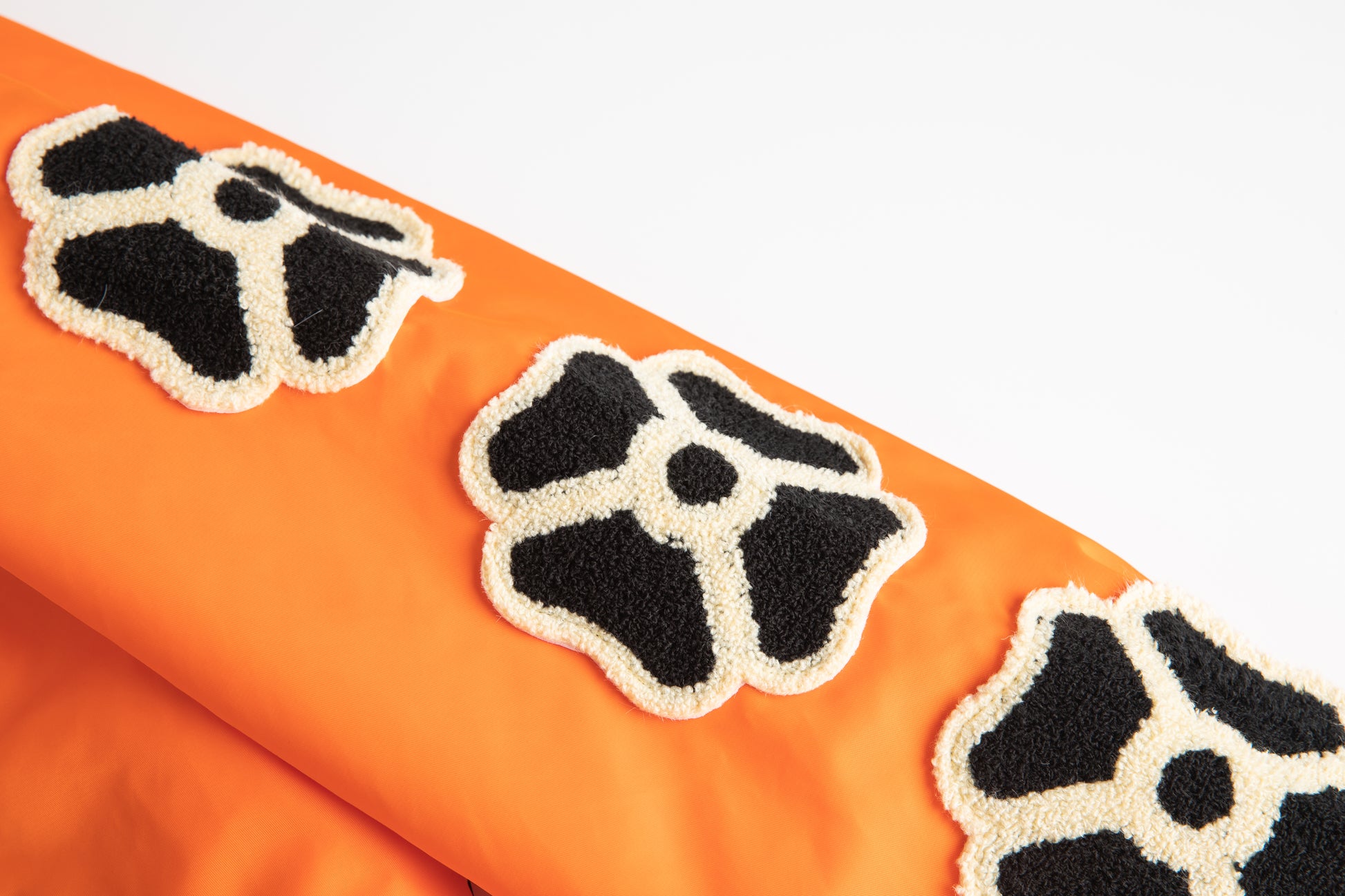 - Chenille patch at back, right, and left sleeve in black and cream.