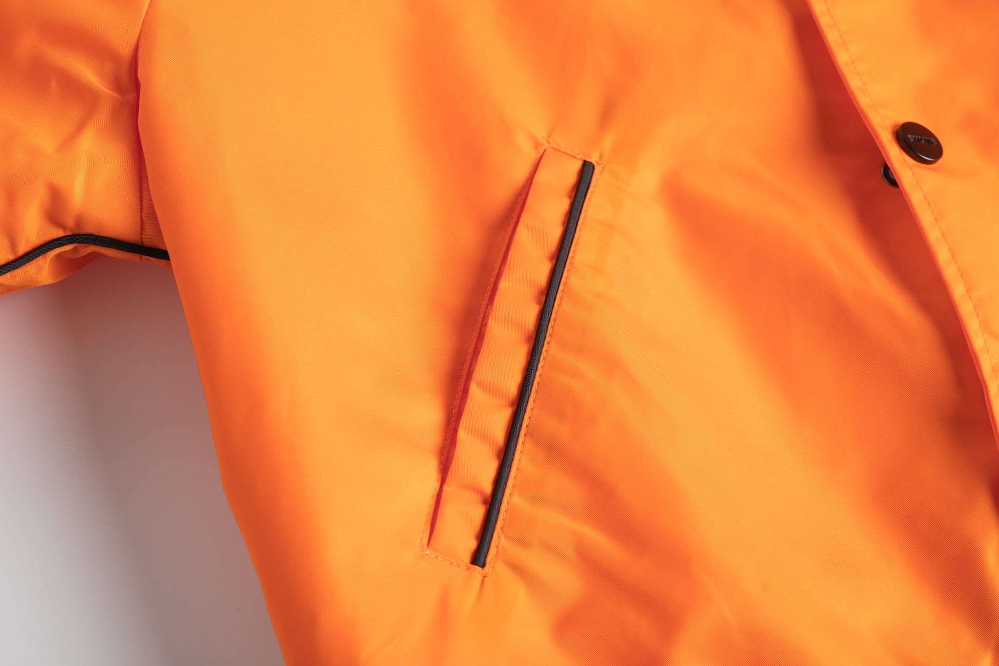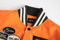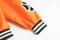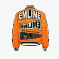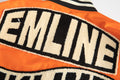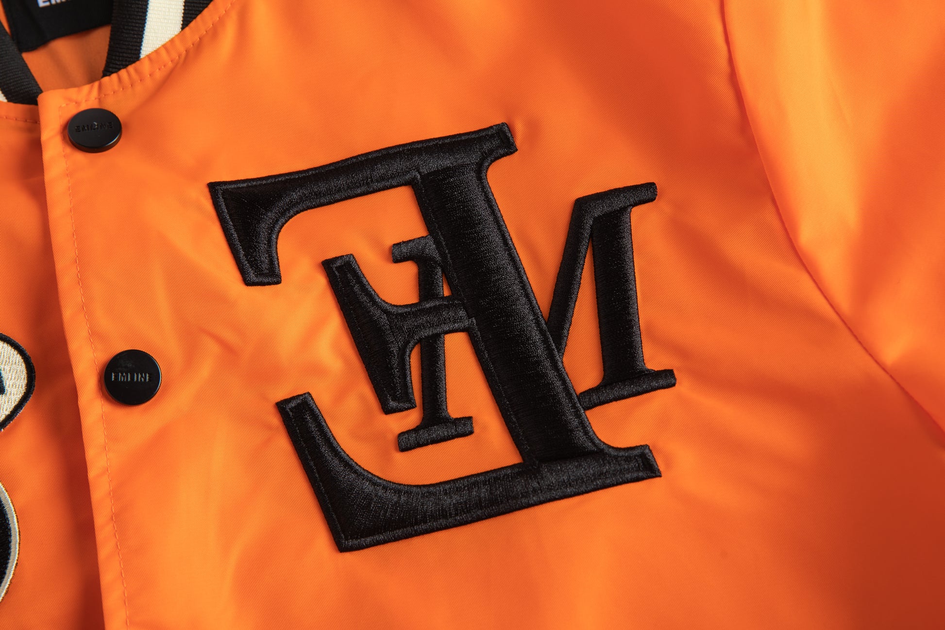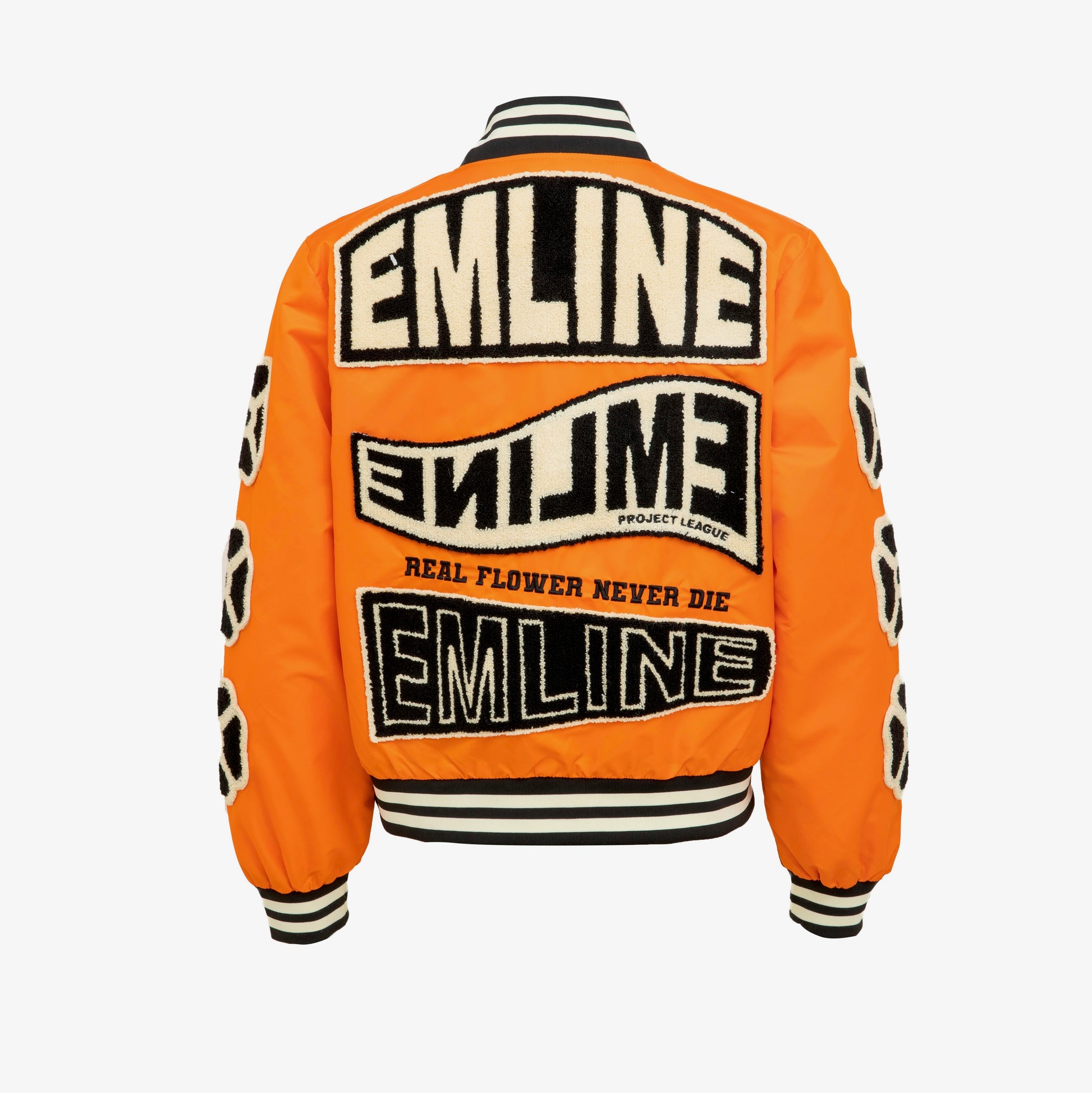 - Chenille patch at back, right, and left sleeve in black and cream.