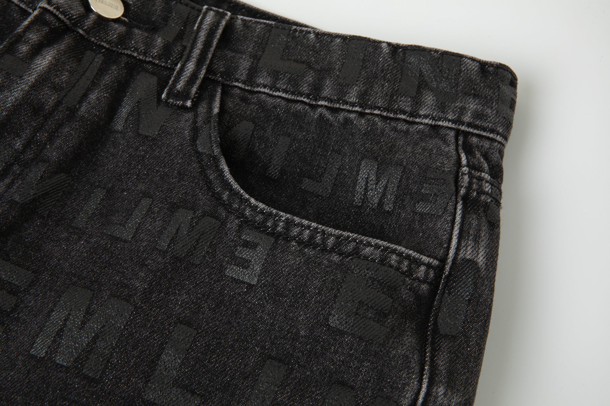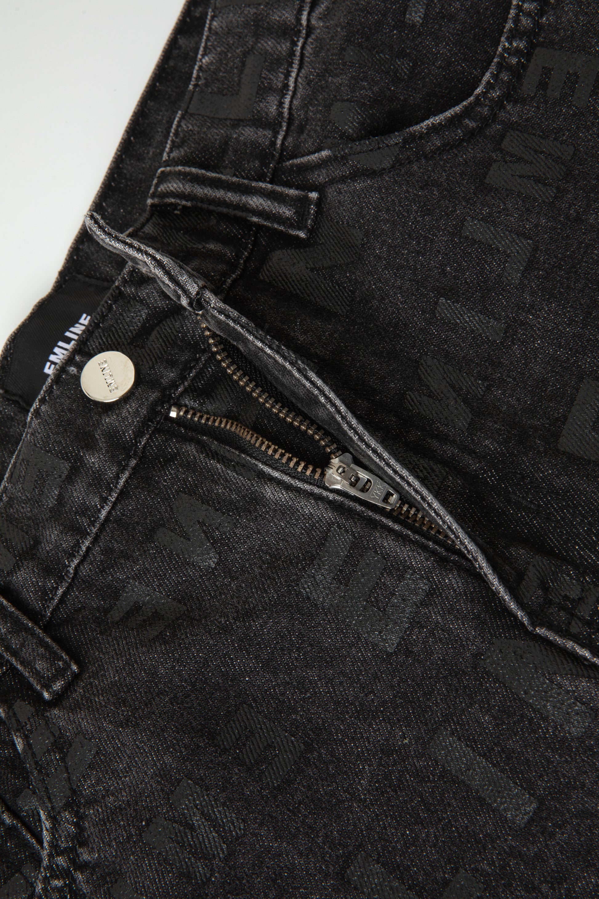 - Silver single button and zipper fly.