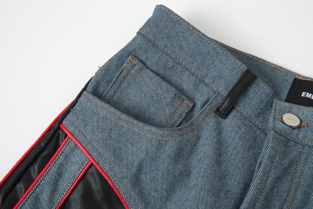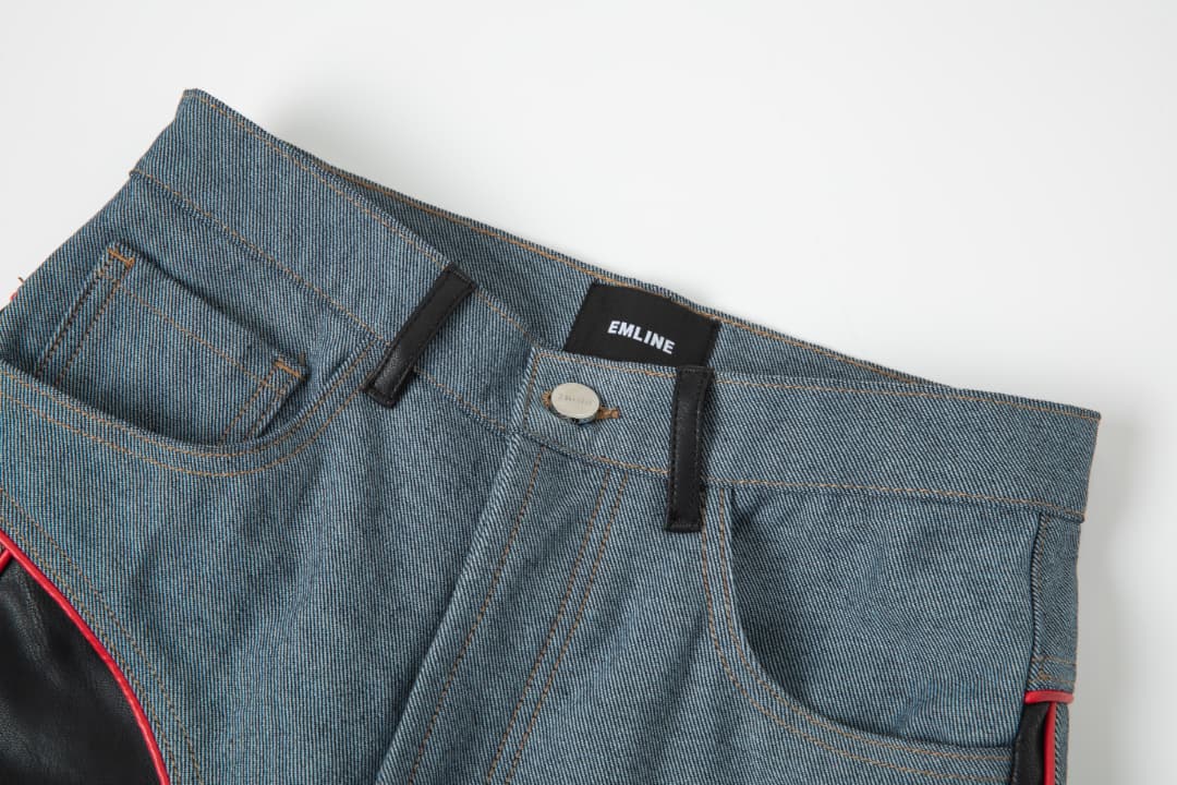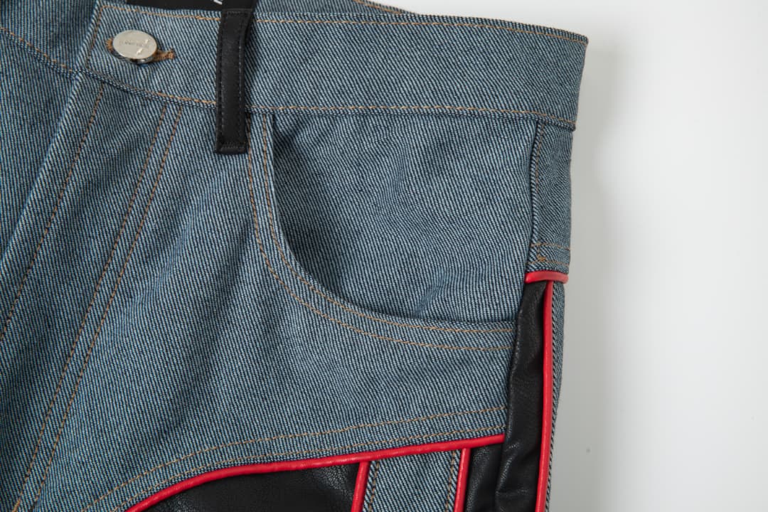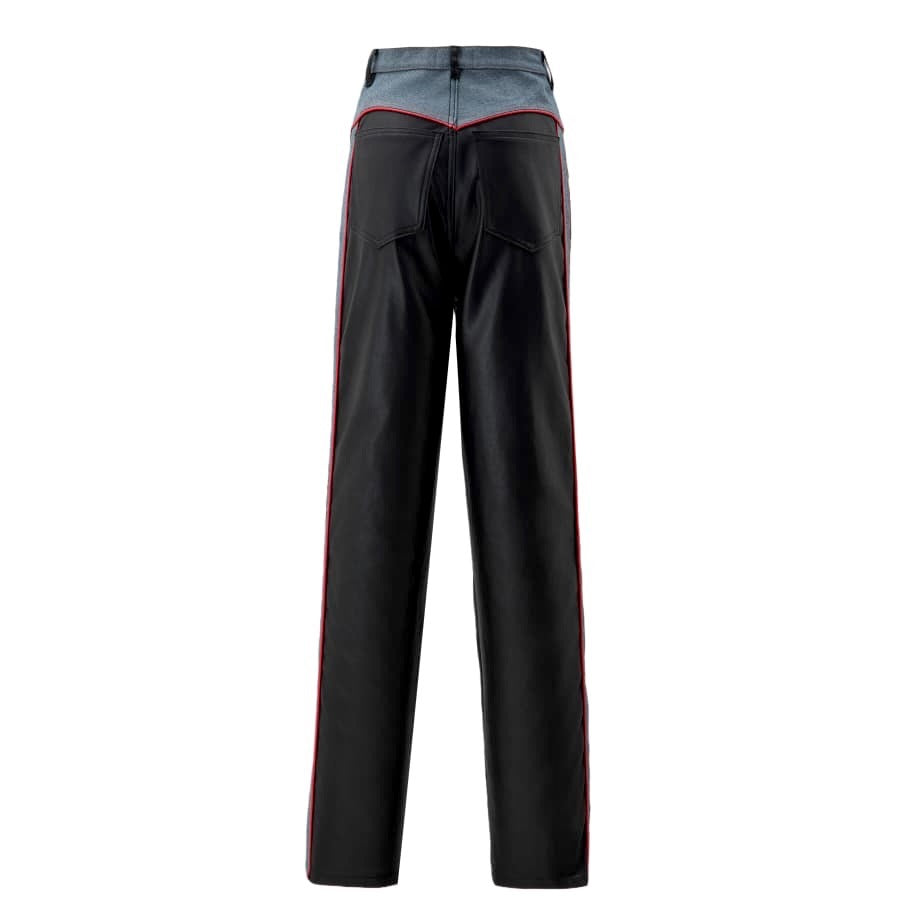 - Women's denim/faux leather pants in blue.