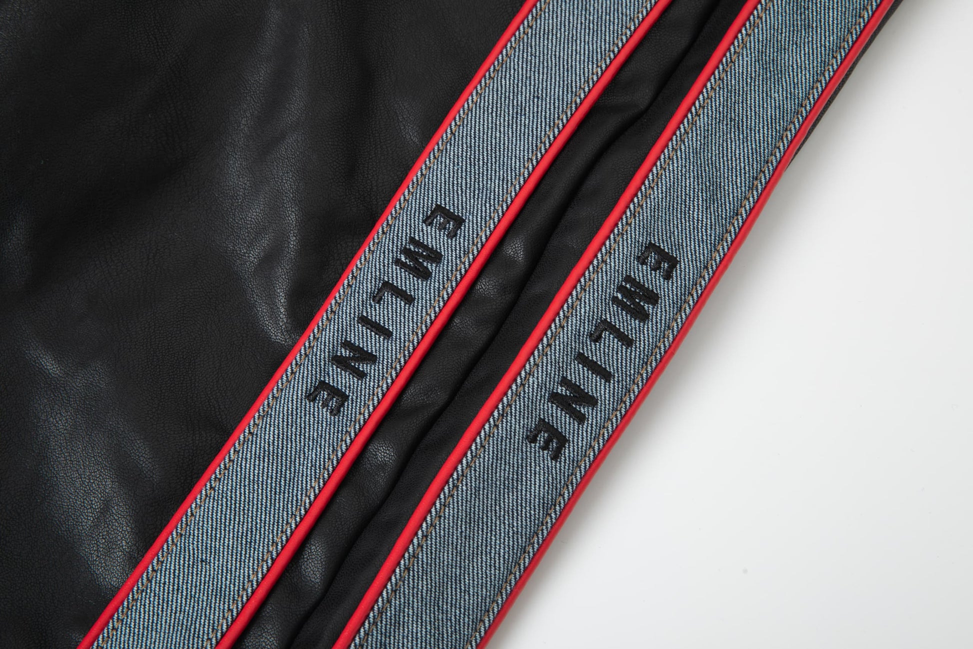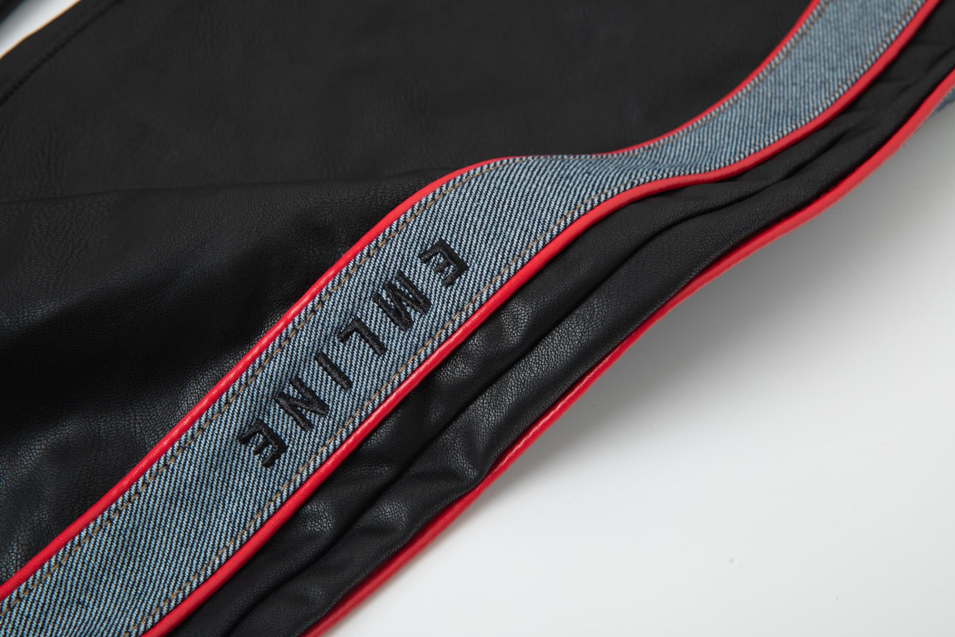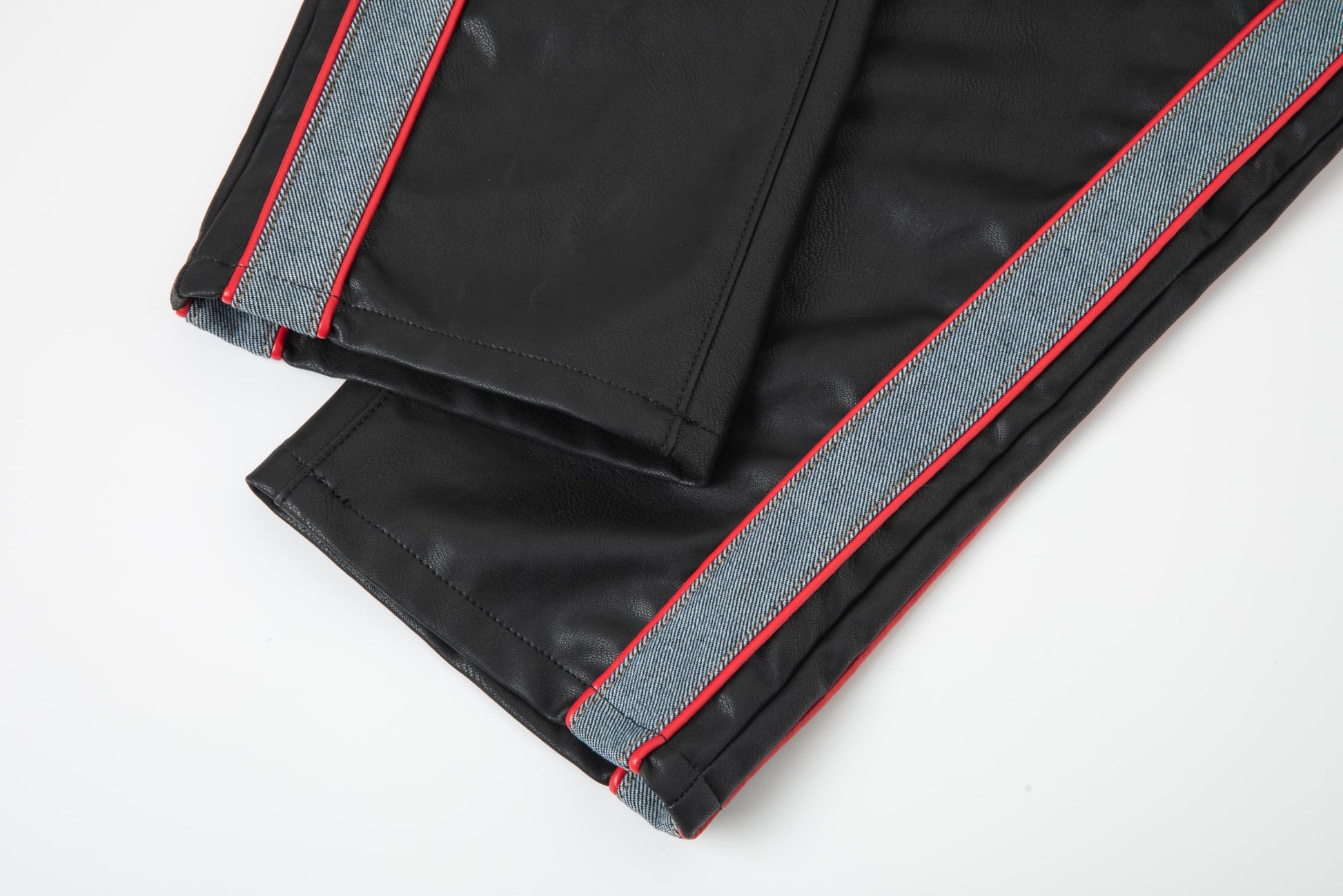 - Piping at right and left legs in red.